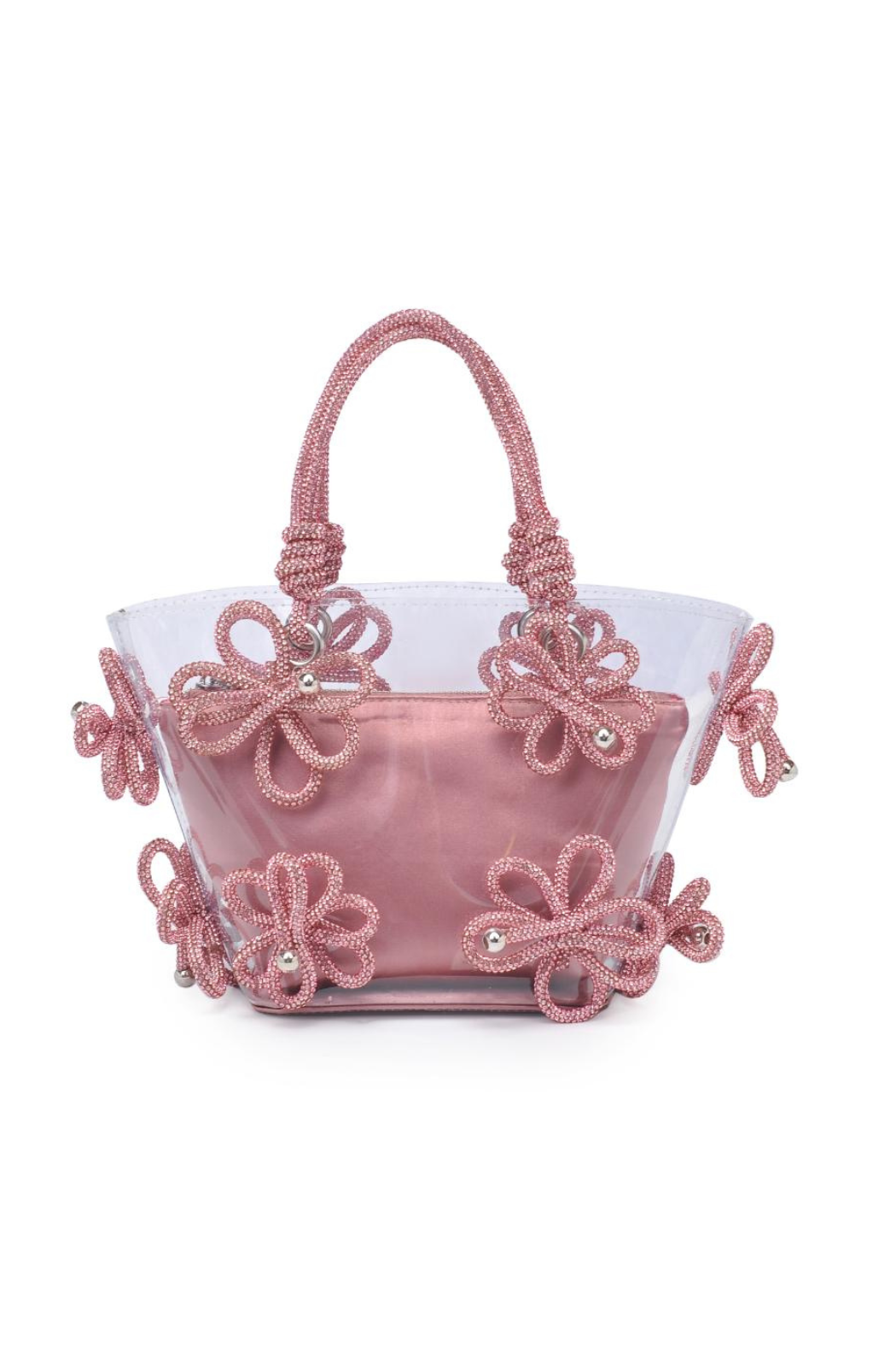 Exterior Details: Transparent Design, Rhinestone Flower Details, Knotted Rhinestone Handle, Silver Hardware