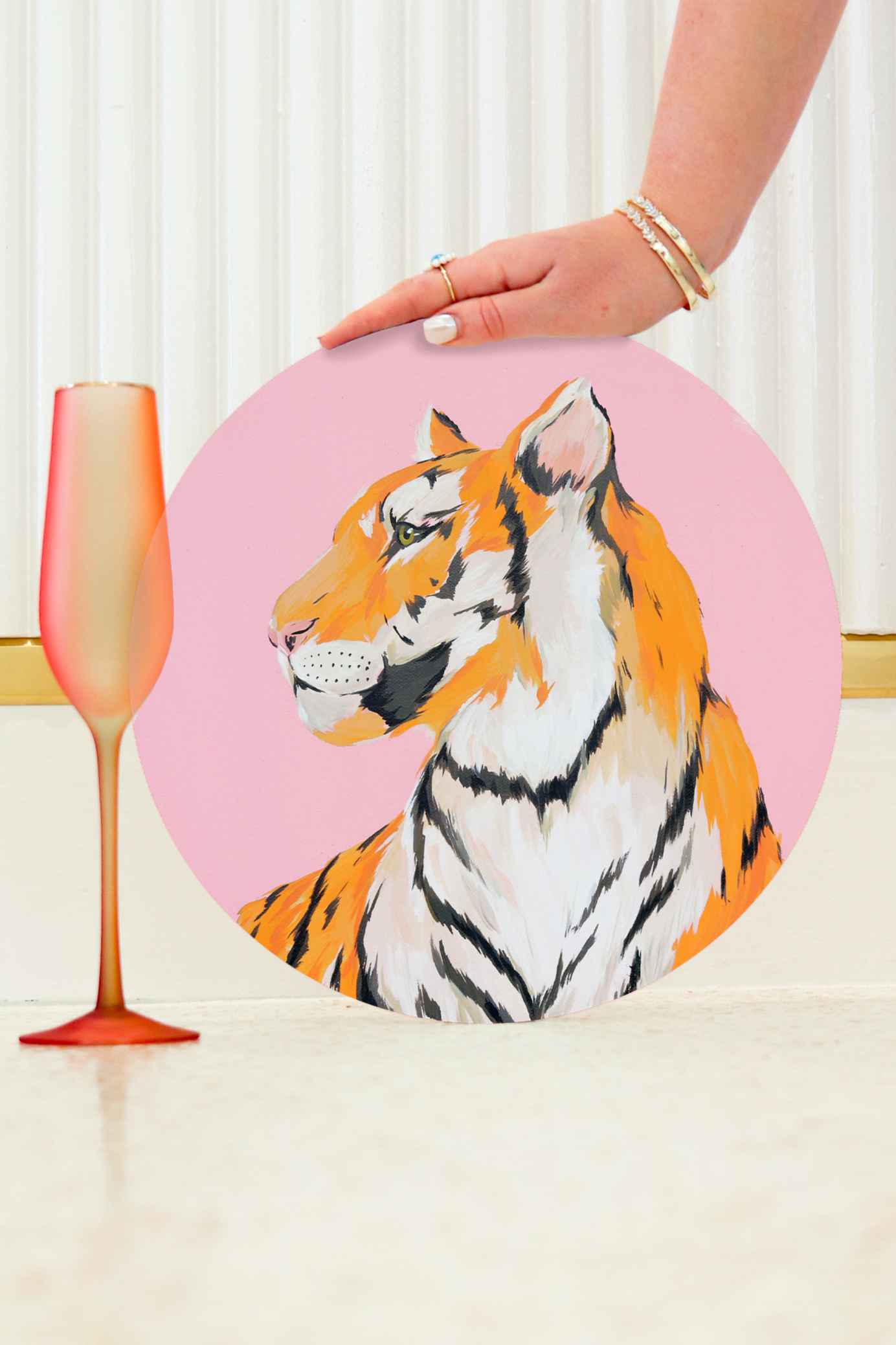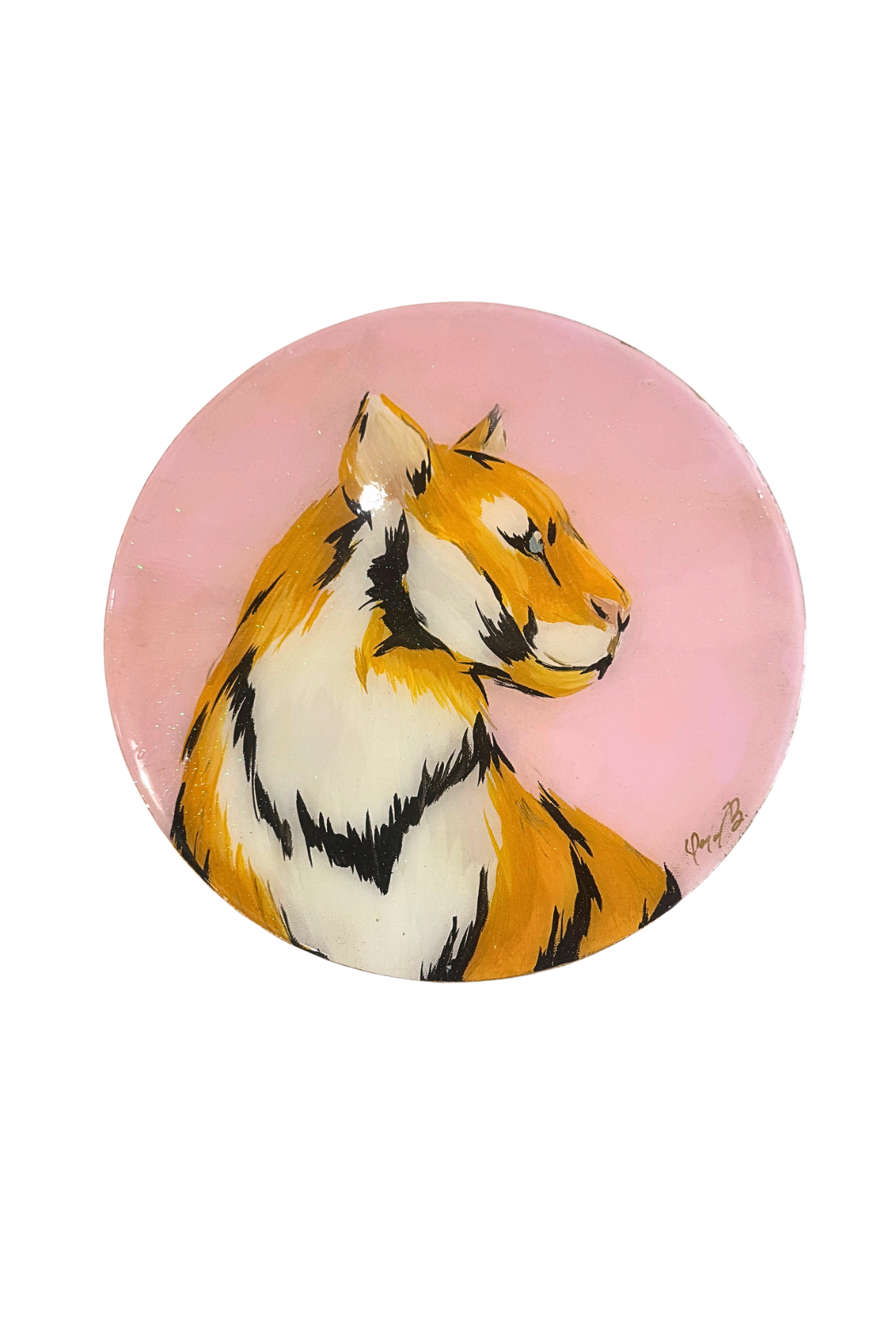 These one of a kind pieces are 12x12 inch round canvases finished in a hand-poured poly acrylic resin.