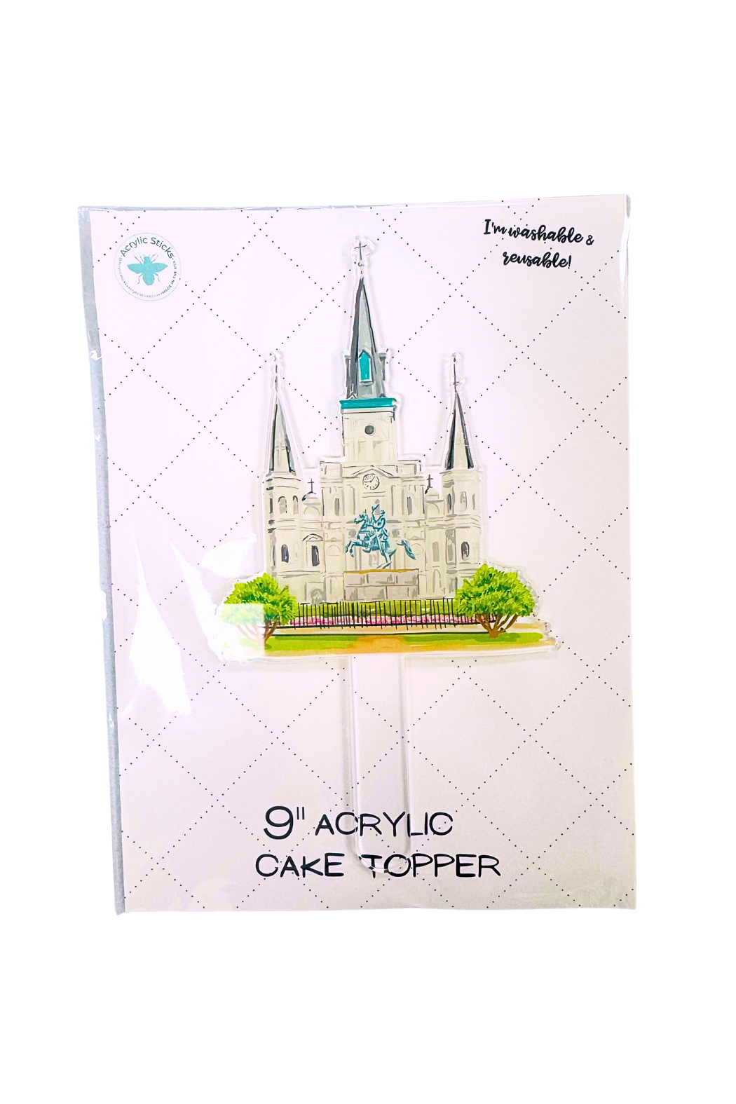 Acrylic Cake Topper is a reusable 9" acrylic cake decoration shaped like a landmark and mounted on clear stakes for easy placement. The topper adds a polished, celebratory accent to cakes and dessert tables with its detailed printed artwork. This piece is lightweight and wipe-clean for simple reuse after events. It is produced by Acrylic Sticks, LLC and designed for party and entertaining use.