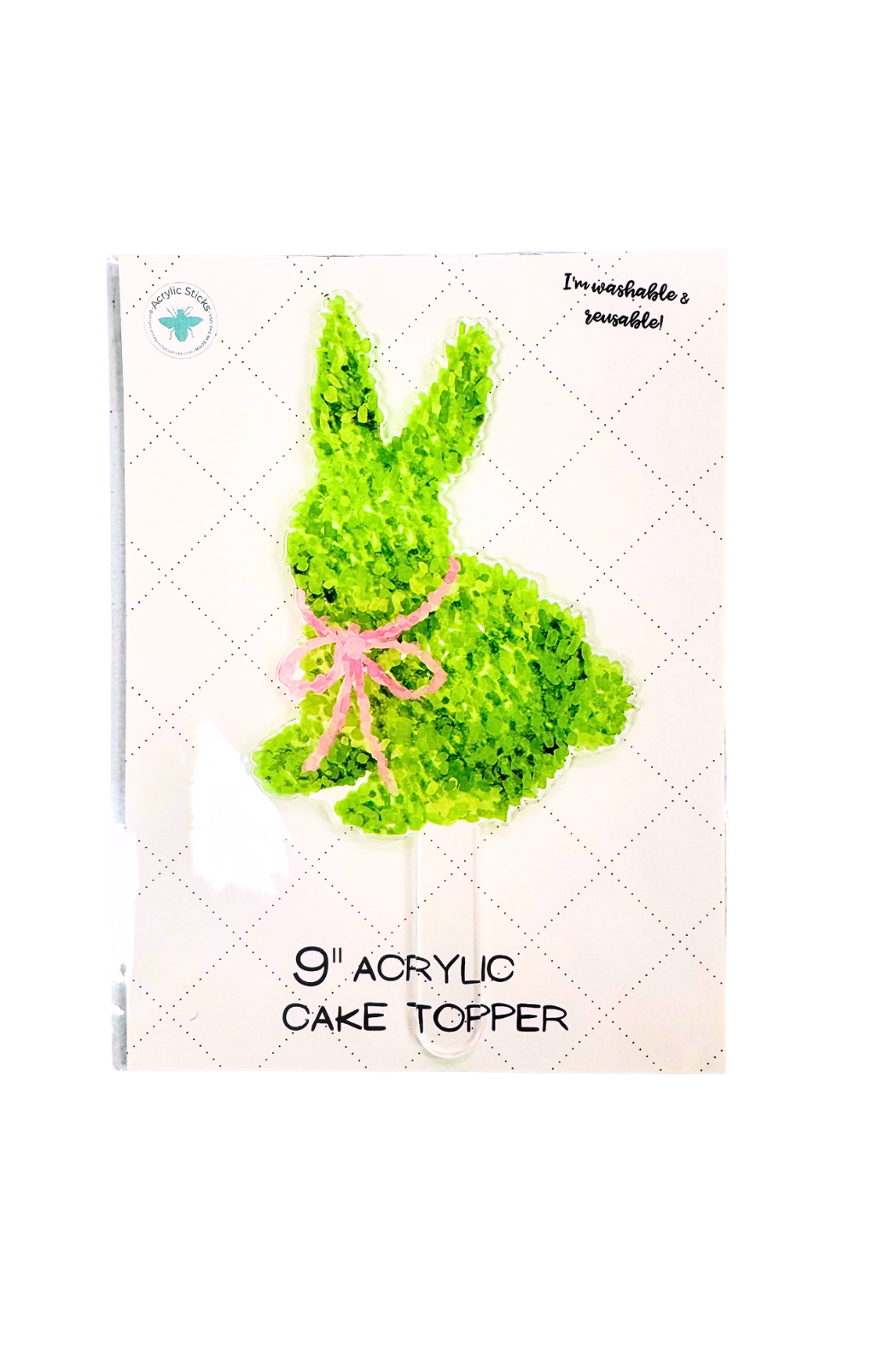 Acrylic Cake Topper is a decorative 9-inch acrylic cake pick shaped like a green bunny with a pink bow, made to sit atop celebration cakes. This lightweight topper adds a playful, seasonal touch to birthday or springtime desserts. The piece is reusable and easy to clean, and it is sold by Acrylic Sticks, LLC for fuss-free entertaining.