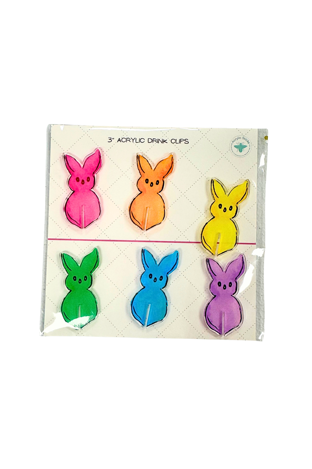 Acrylic Drink Clips are colorful acrylic glass markers shaped like playful bunnies to keep beverages identifiable at gatherings. The set features six 3-inch clips in bright pastel hues with a simple slit to attach to glass rims. These lightweight drink markers add a festive, whimsical touch to tablescapes and are easy to clean and reuse. The product is made by Acrylic Sticks, LLC, offering a fun accessory for parties and entertaining.