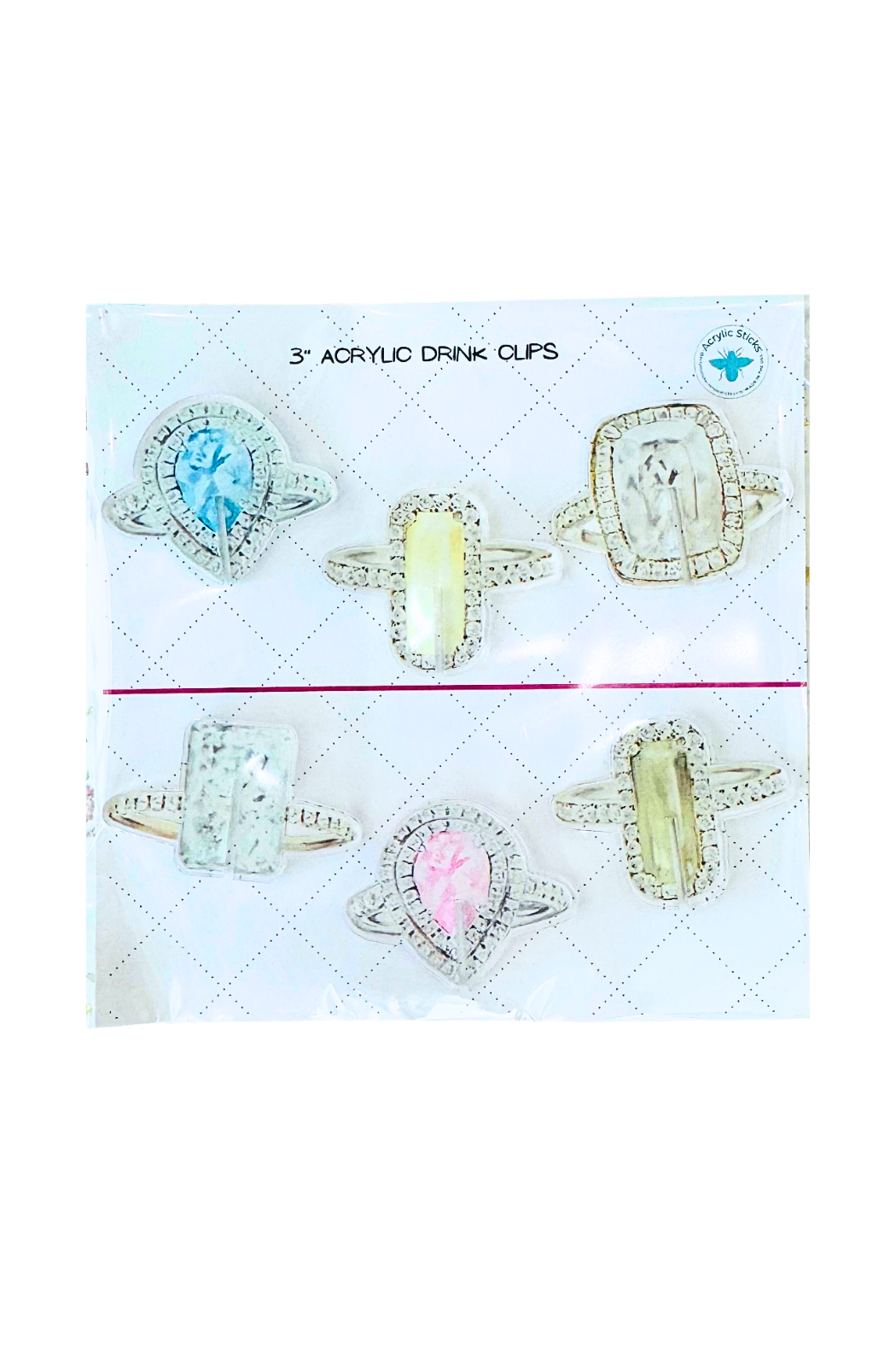 Add a bit of sparkle to your next gathering with Acrylic Drink Clips. These decorative acrylic clips secure to glassware to identify drinks while doubling as charming accents. The set is lightweight, reusable, and shaped like gemstone rings for a playful, elegant look. The product is made and sold by Acrylic Sticks, LLC, perfect for parties, showers, or casual get-togethers.