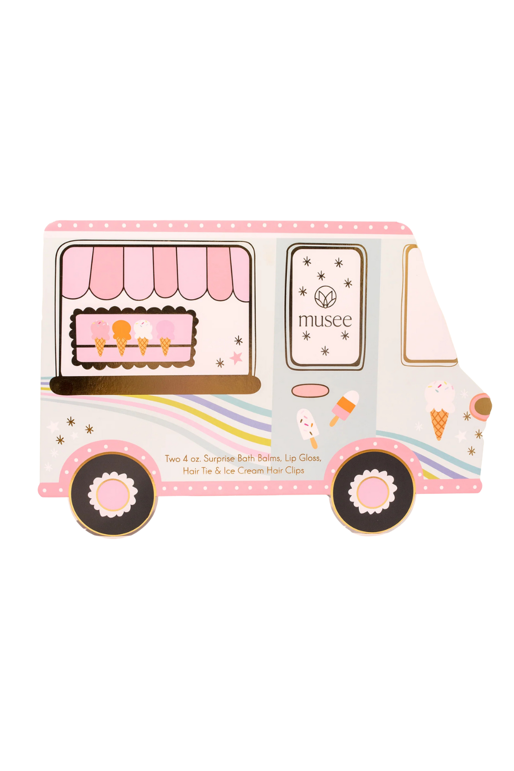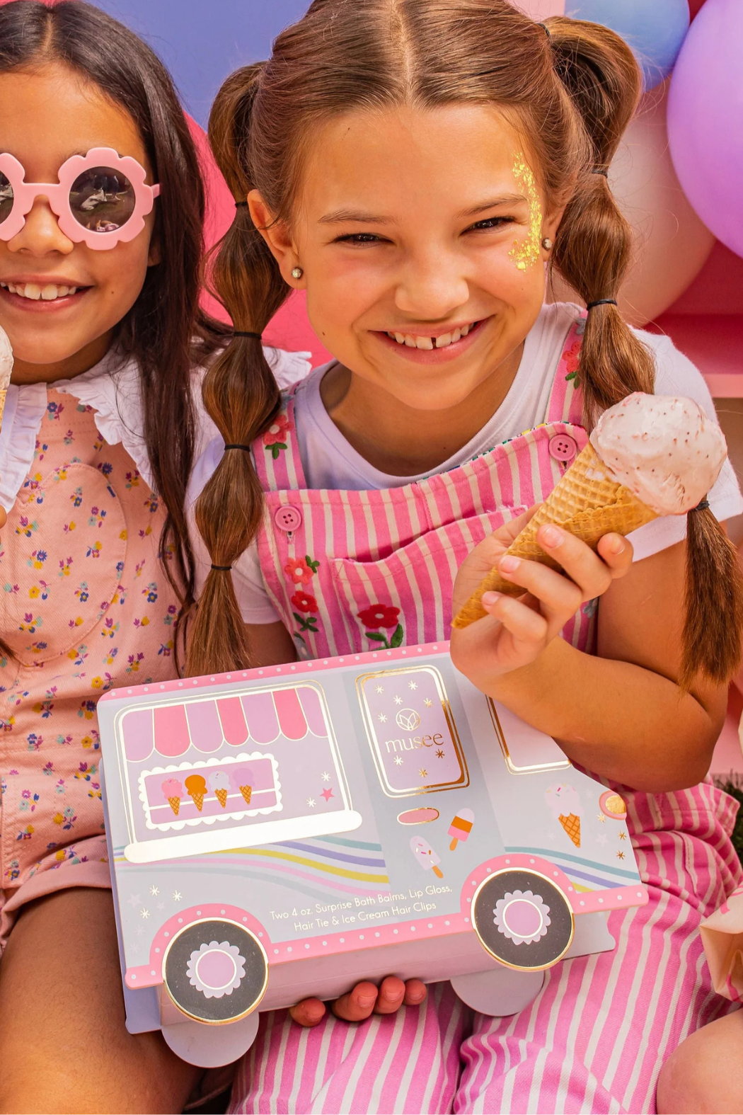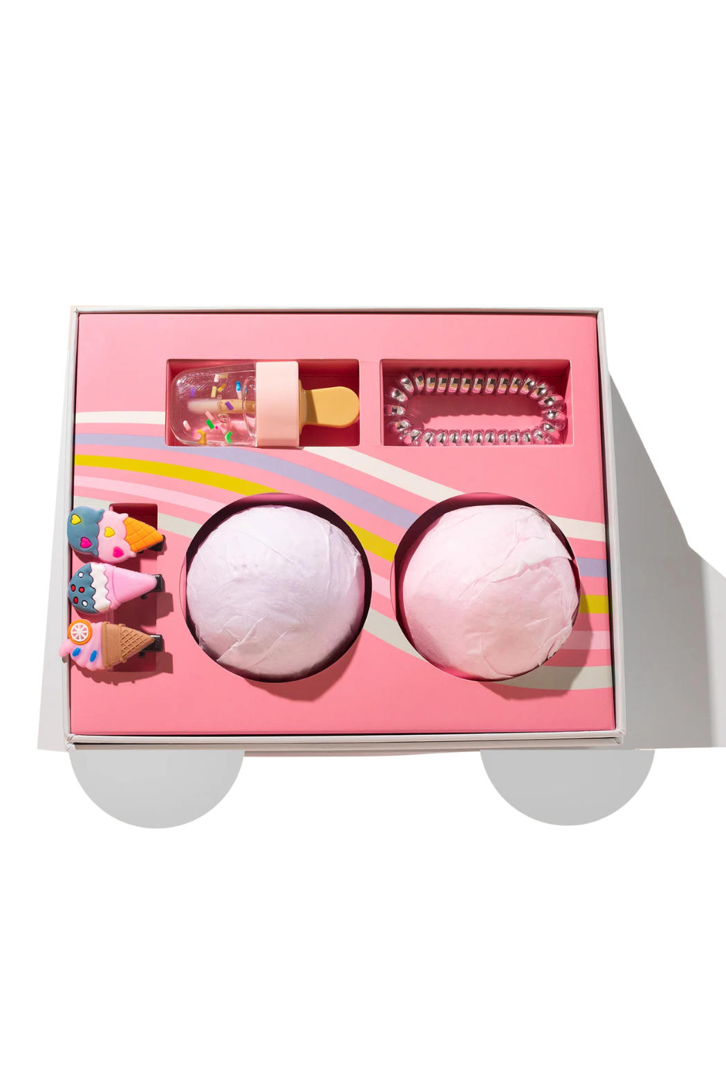 I scream, you scream, we all scream for ice cream! This set features two sugar and vanilla cream scented bath balms, lip gloss, hair clips, and a fun hair tie!
