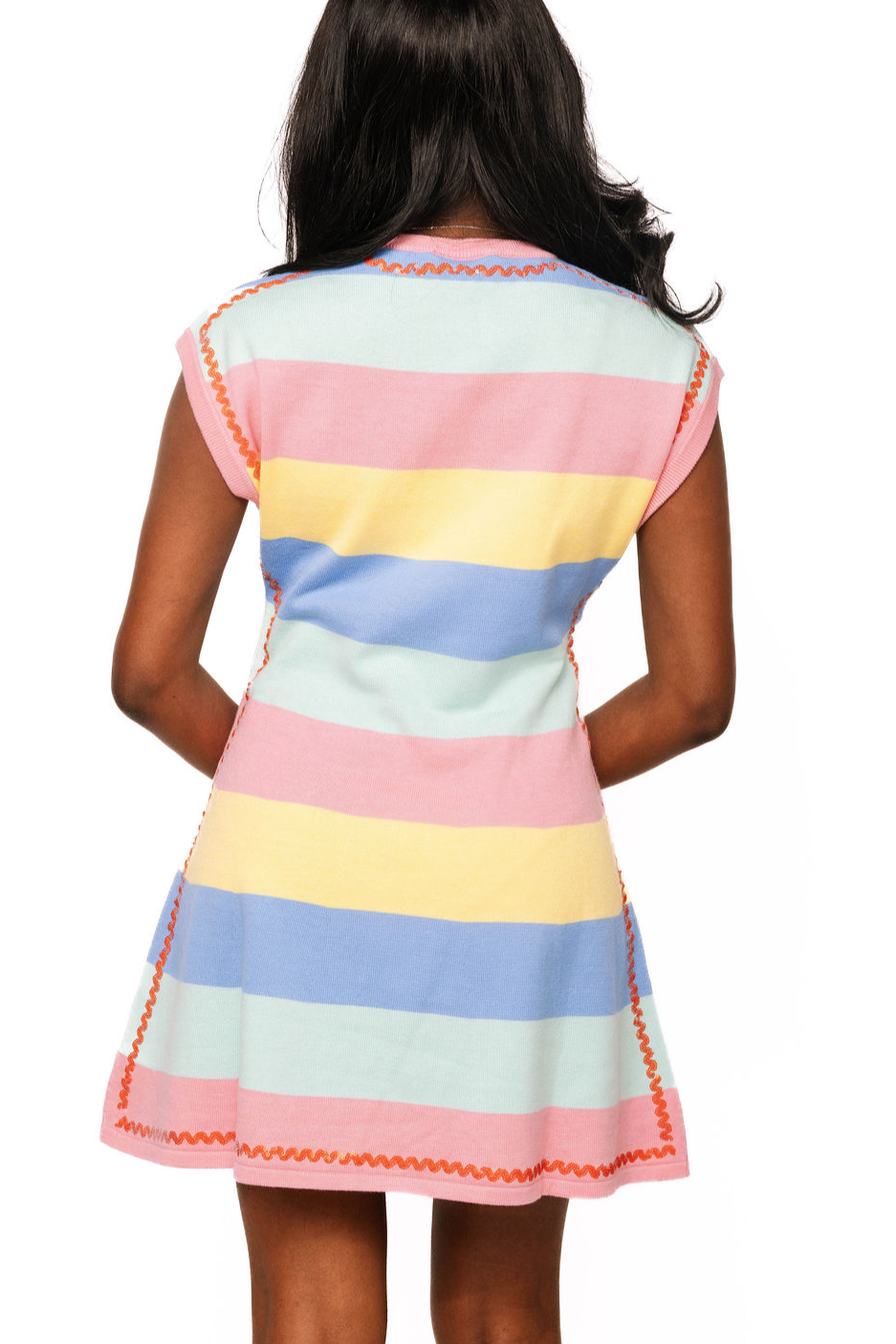 A playful knit mini with a sequined butterfly across the chest and bold pastel stripes, perfect for brightening everyday looks. The Butterfly Knit Dress is crafted in sweater knit with short capped sleeves and a relaxed shift silhouette. Queen Of Sparkles adds eye-catching sequin embellishment for a trendy, retro-inspired vibe that's ideal for casual outings.