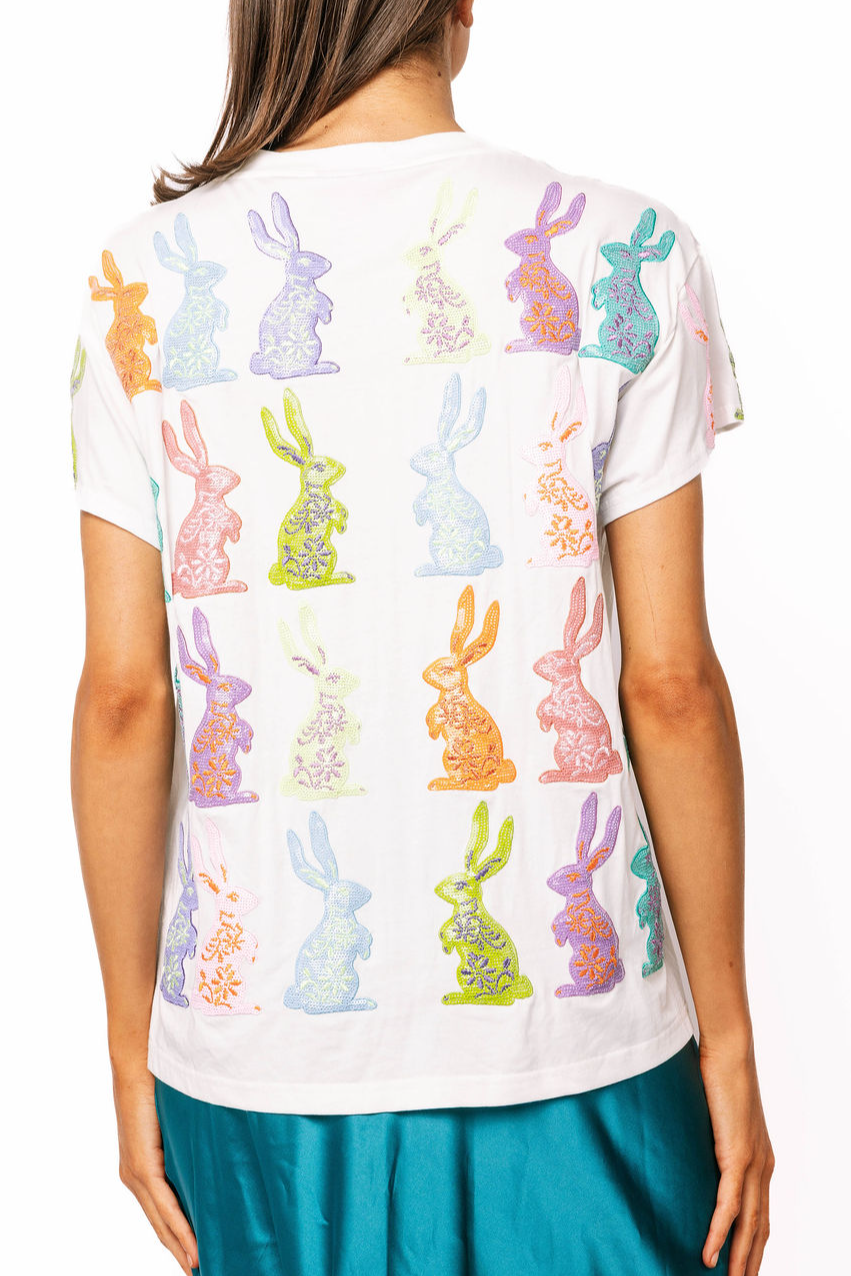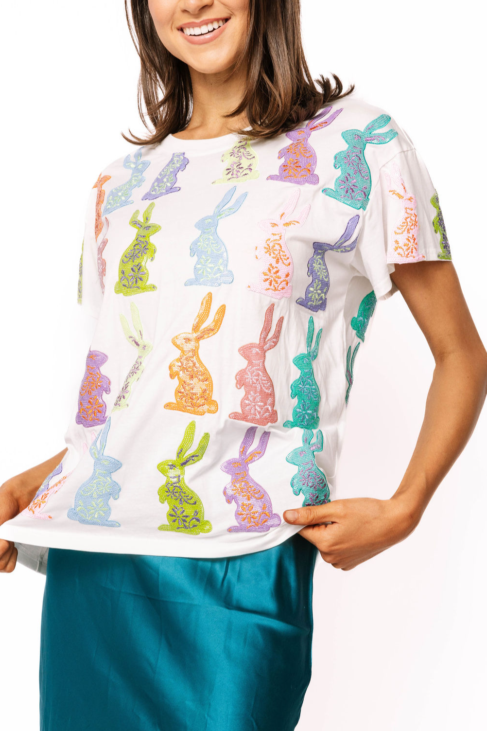 A playful cotton tee printed with rows of pastel Easter bunnies for a festive spring look. The Easter Bunny Tee from Queen Of Sparkles has a relaxed fit and a classic crew neckline for easy everyday wear. Short sleeves and a straight hem keep the silhouette casual and comfortable. Pair it with denim or a skirt for a lighthearted seasonal outfit.