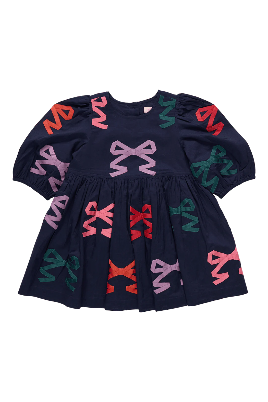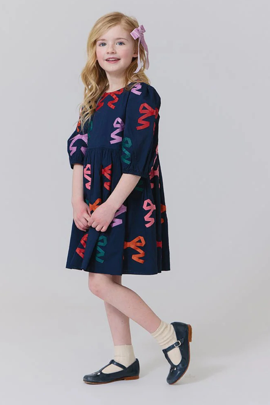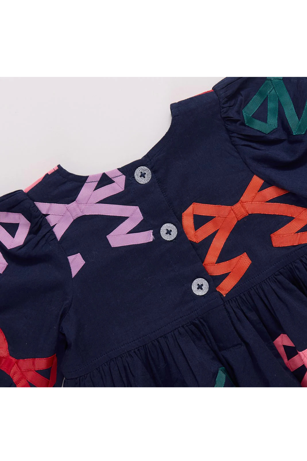 Fun And Festive! A colorful mix of grosgrain ribbon bows pop against a solid navy ground in our not-just-for-parties Girls Brooke Dress. Classic design elements include a rounded neck, full skirt twirl-worthy skirt, 3/4 puff sleeve and silver glitter buttons at the back.