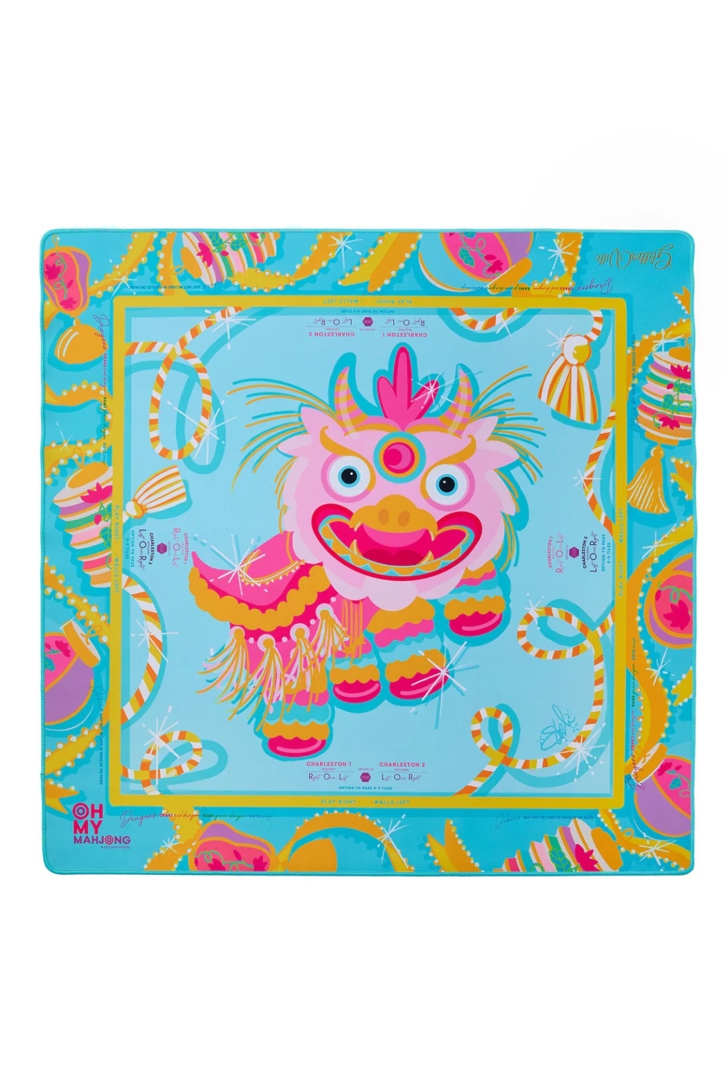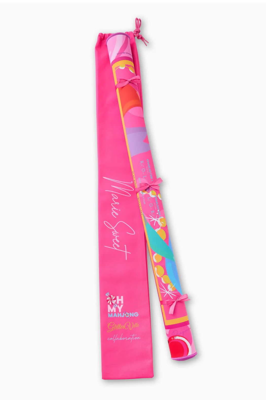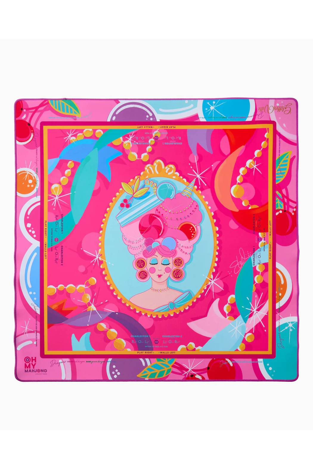 Bring the sparkle of Glitterville to your game with the Marie Sweet Mat, a fantastical design alive with bold blues, bubblegum pinks, and Marie Sweet that feels straight out of a fairytale. Surrounded by starbursts and sweet-as-candy florals, this mat pairs beautifully with the Glitterville Tiles, creating a setup that’s as joyful and vibrant as the game itself. Bright, playful, and full of charm, the Marie Sweet Mat makes Mahjong feel like a party every time the tiles hit the table.