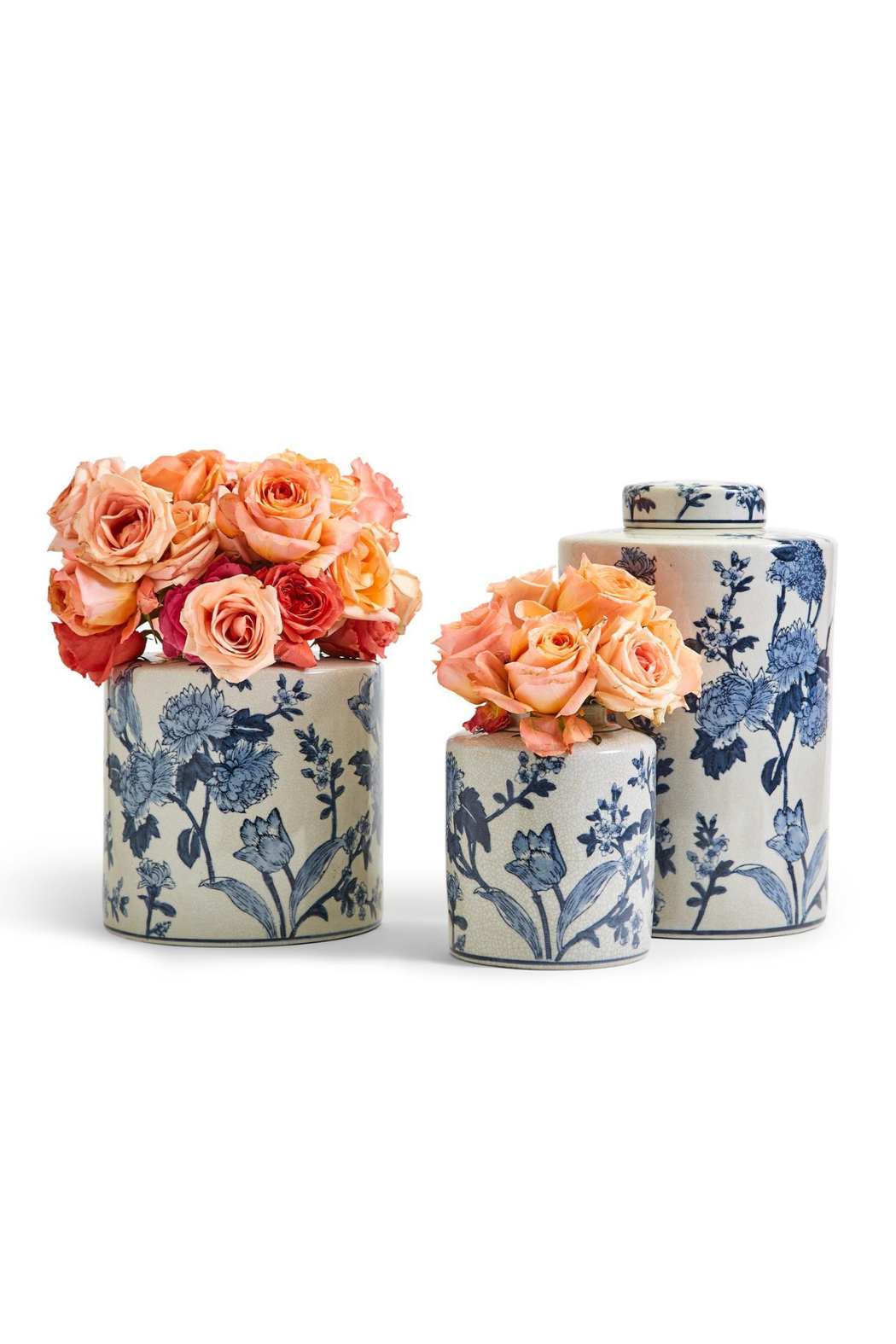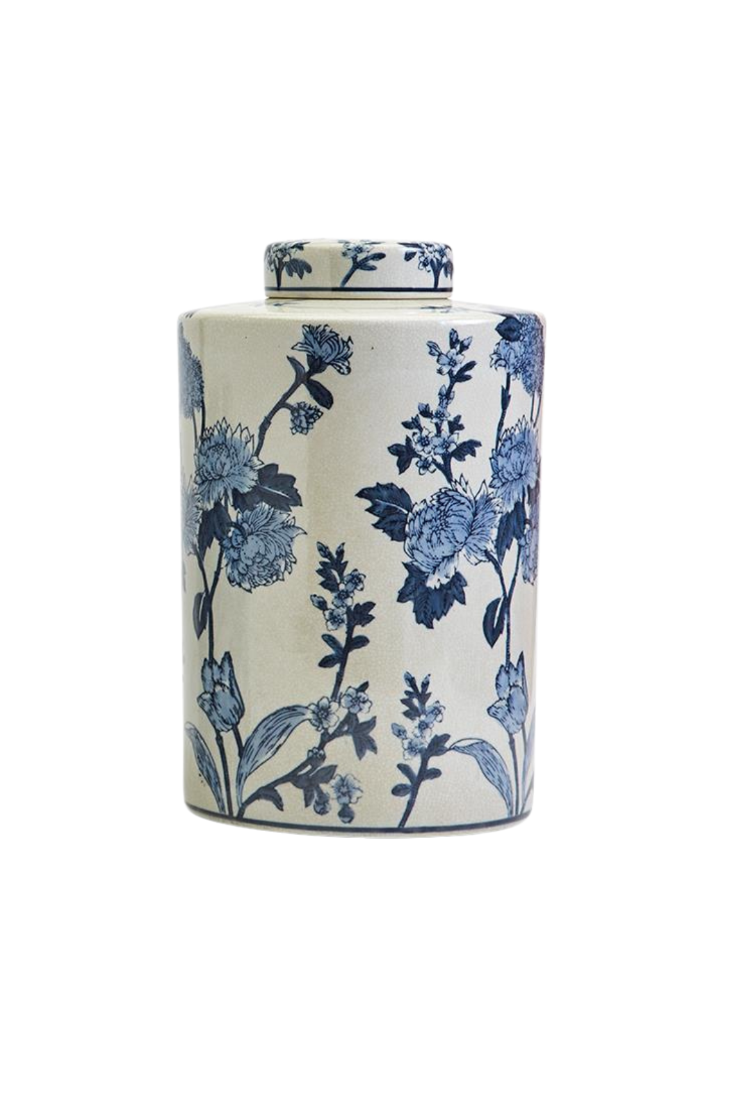 Keep your go-to dry ingredients on the counter with these handmade blue and white chinoiserie tea jars. Each jar strikes a simple cylindrical silhouette with a round lid.