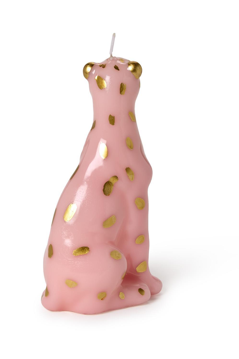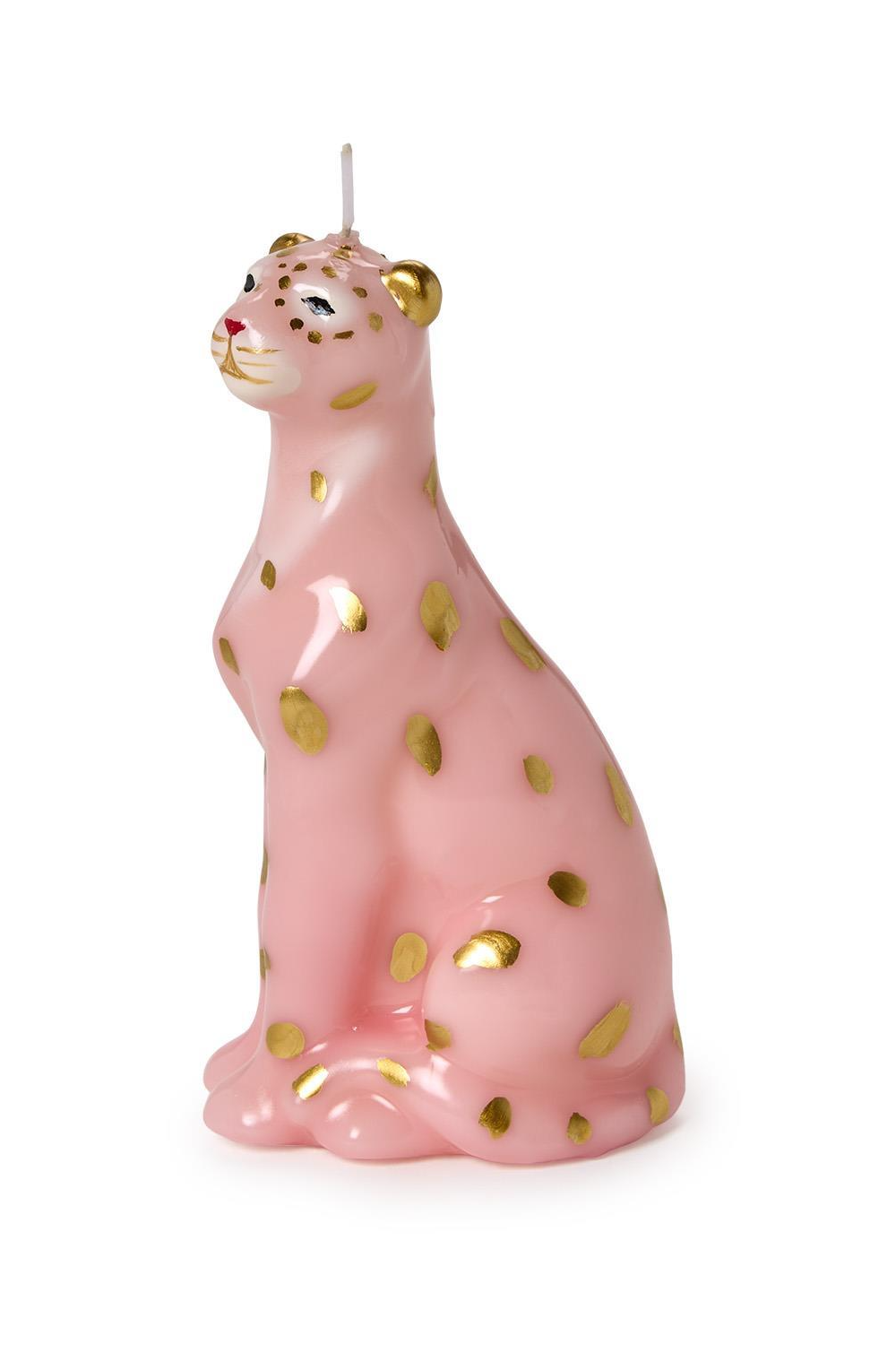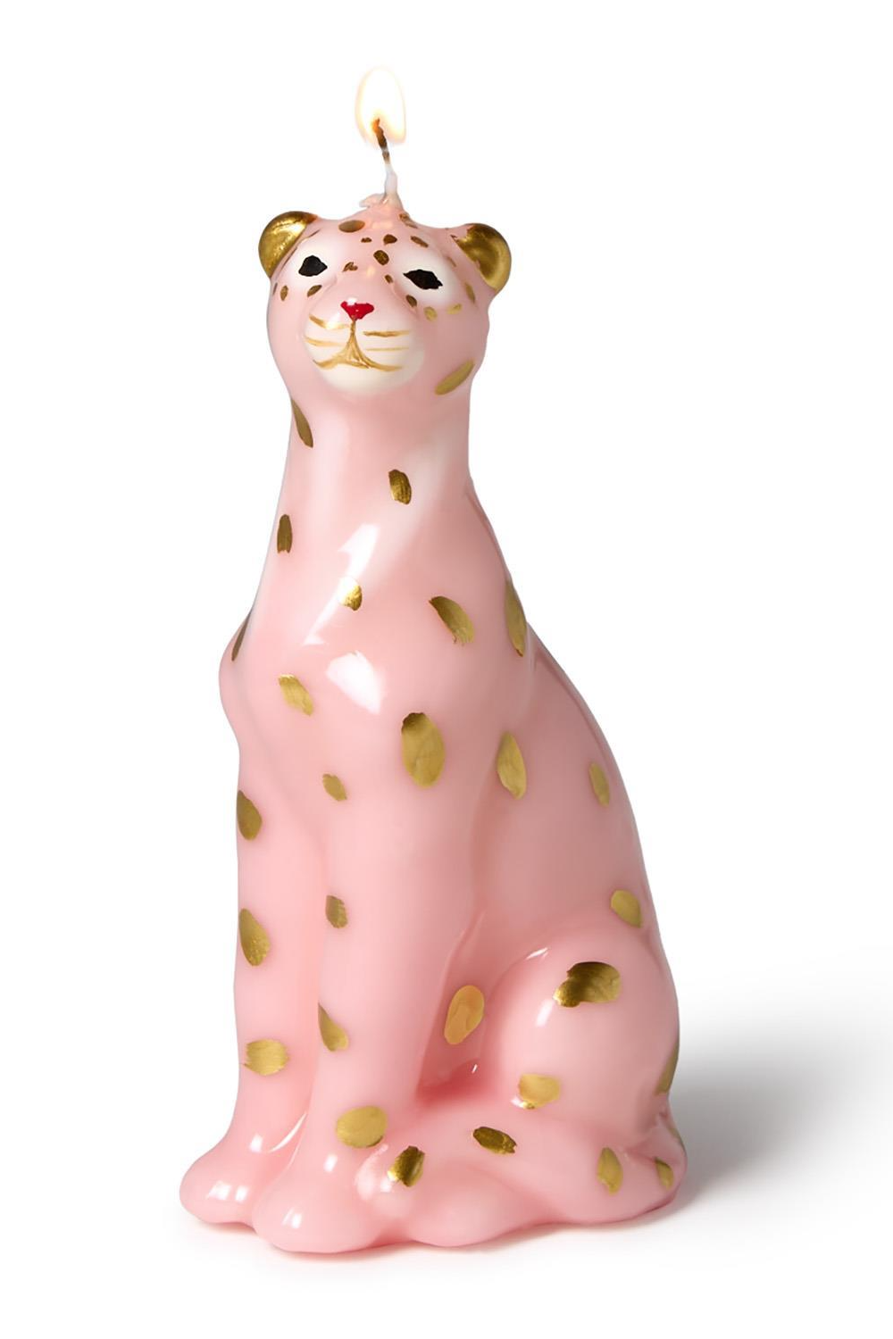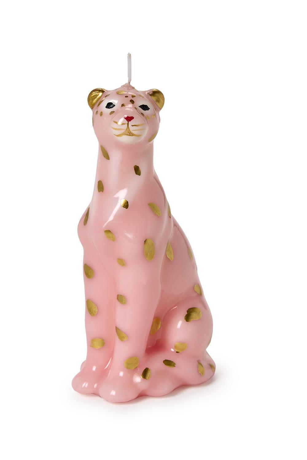 A whimsical sculpted candle shaped like a seated leopard with glossy pink wax and metallic gold spots. The Leopard Sculpted Candle adds a playful, decorative accent to mantels, shelves, or gifting occasions. This collectible-style candle is from Two's Company and reads as both artful decor and a novelty candle statement piece.