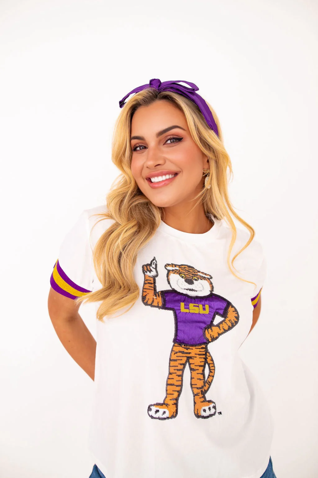 Features Sparkly university logo on chest with beautiful embroidered and appliqué details with stripe trim on sleeves in team colors