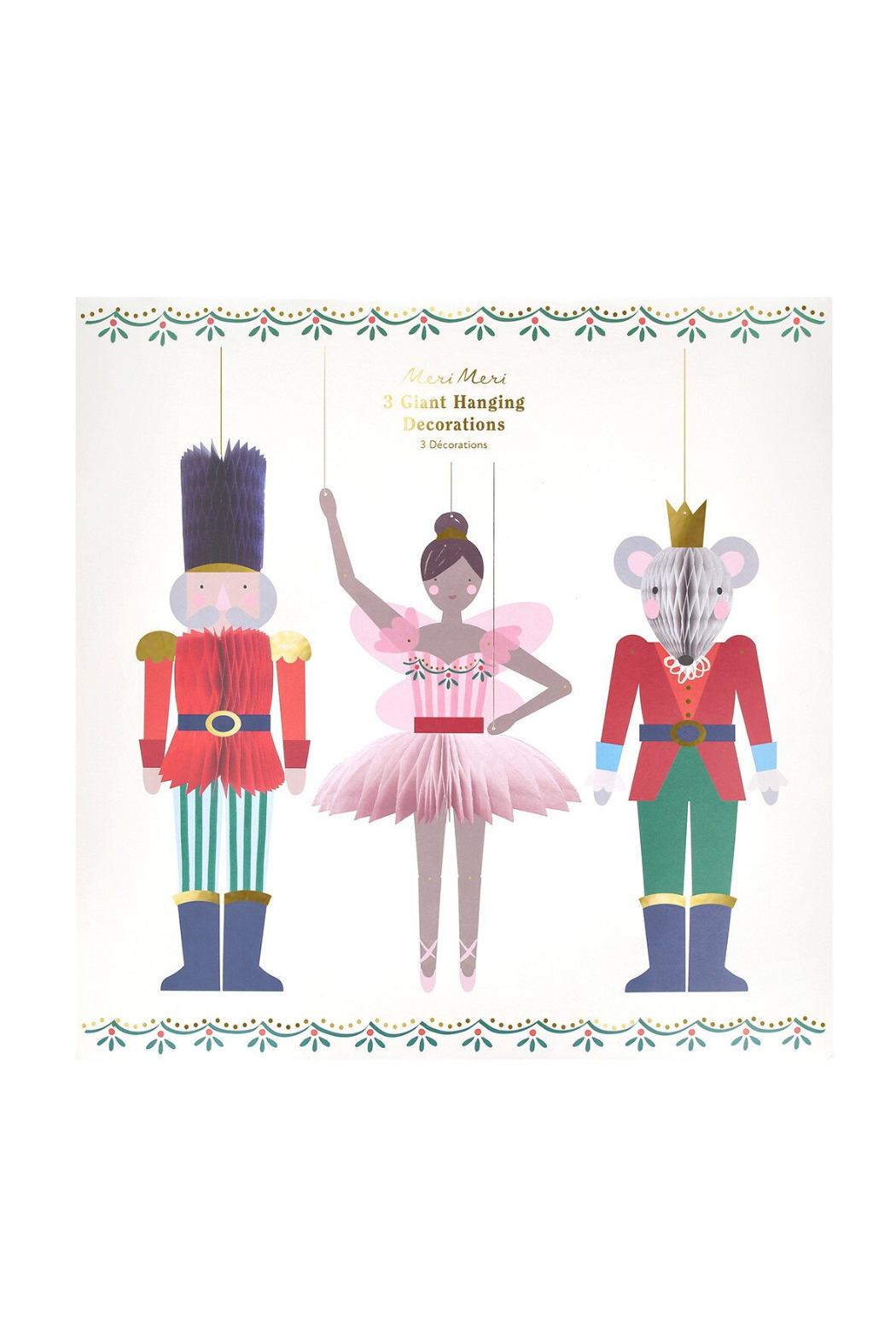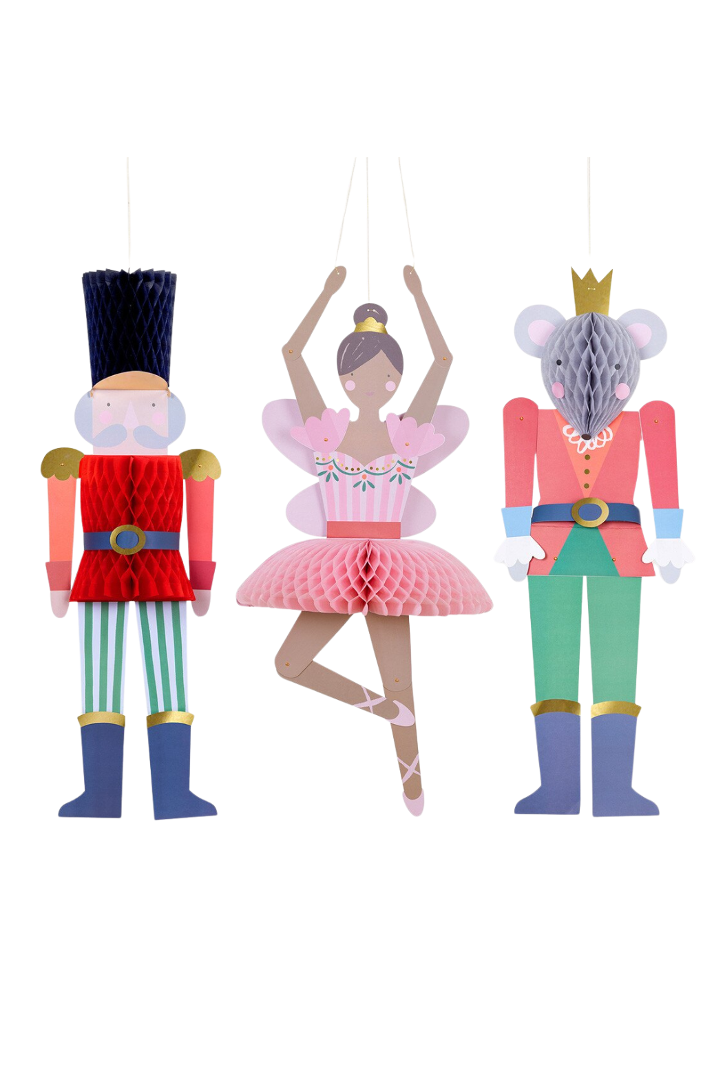 3 x Giant Nutcracker hanging decorations of The Nutcracker soldier, Sugar Plum Fairy and the Mouse King, with honeycomb and shiny gold foil details