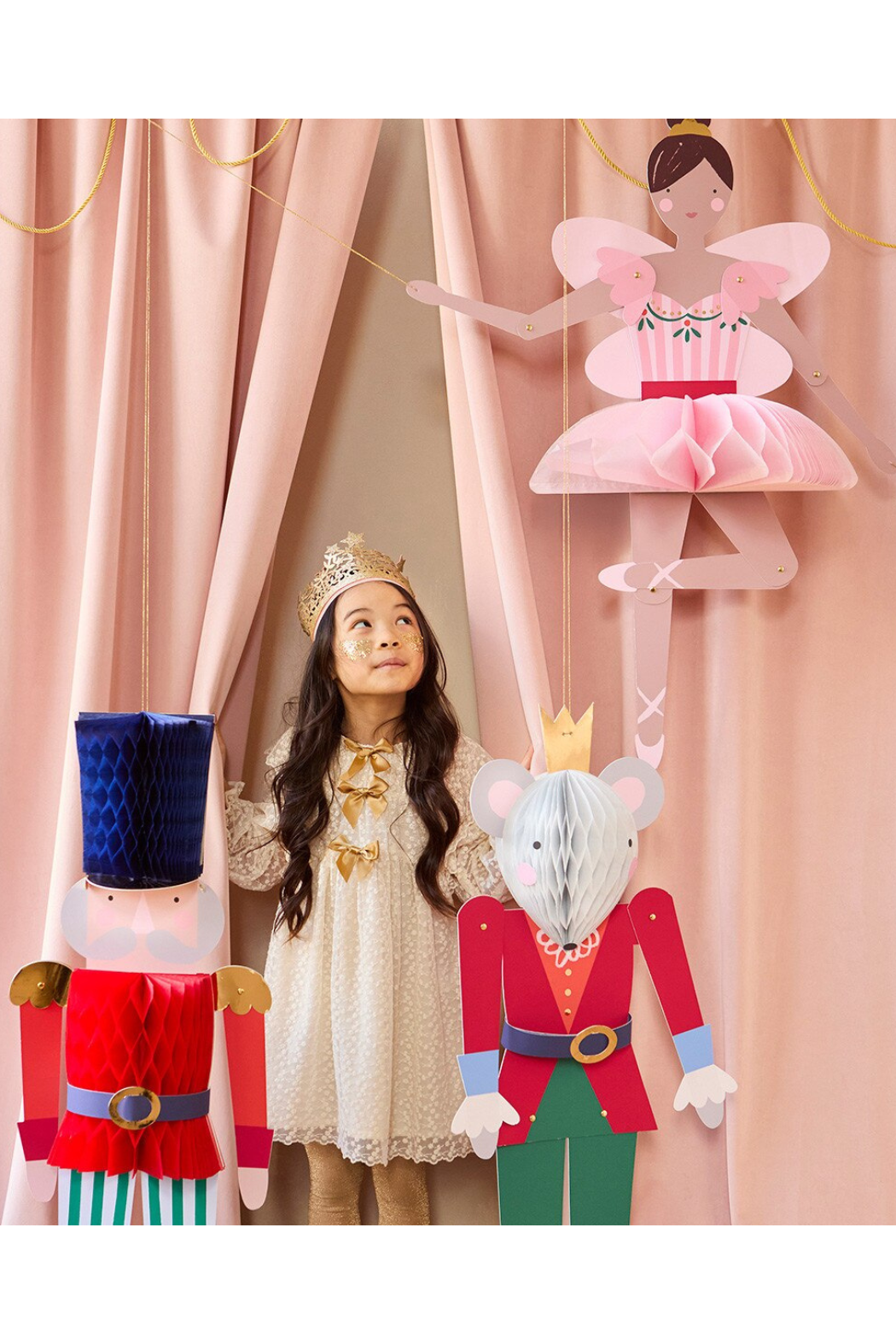 3D Tissue paper honeycomb details on the hat and body of The Nutcracker; tutu of the Sugar Plum Fairy, and head of the Mouse King