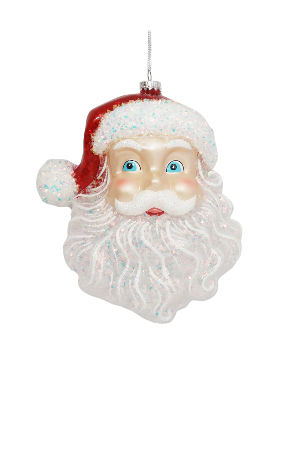 A festive oversized Santa head ornament crafted to hang on a tree or wreath. The Oversized Santa Head Ornament features a glossy red hat, pearlescent face, and a glittered white beard for cheerful seasonal sparkle. Its hanging loop makes it easy to display as part of holiday décor or a themed centerpiece.