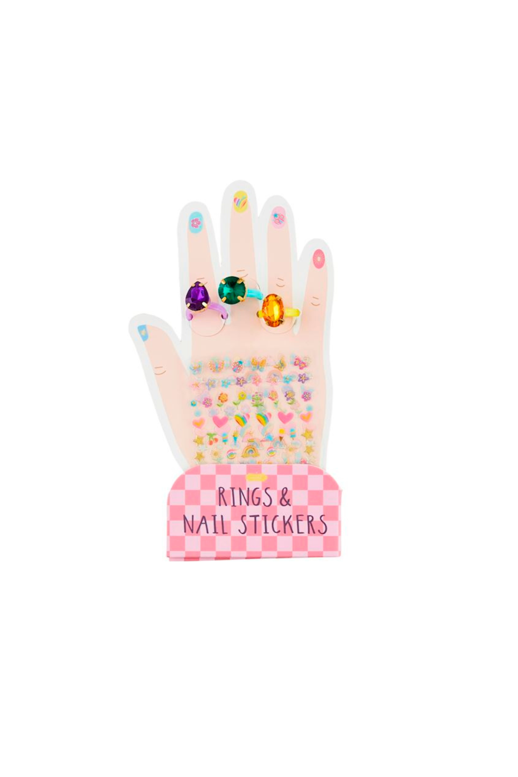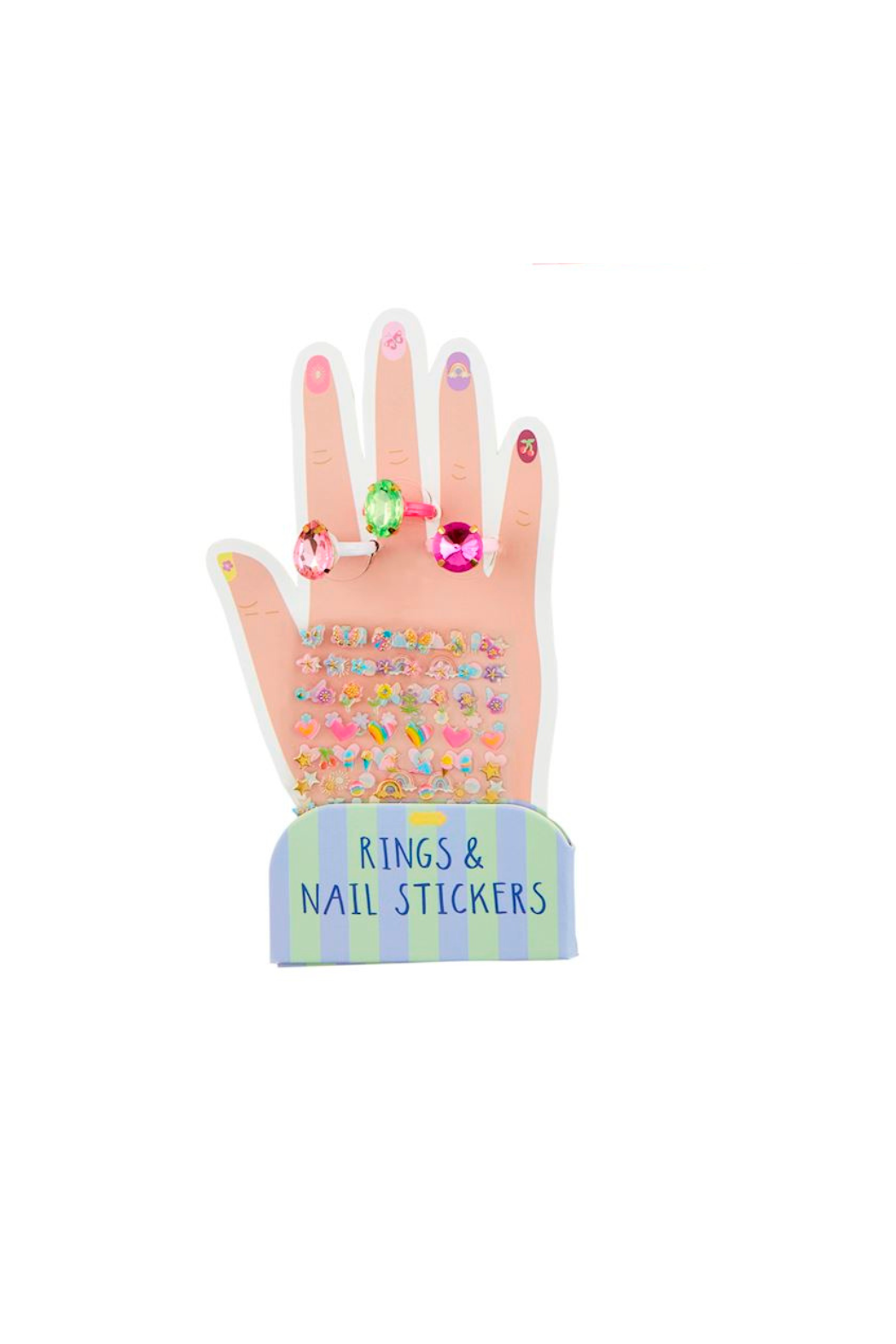 2-piece set. Three adjustable rings come with two sheets of nail stickers on hand shaped display card with displayer. Ages 3+.