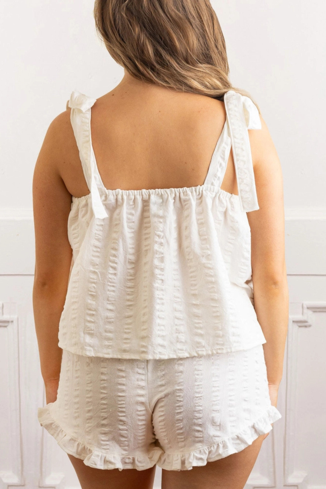 Treat yourself or a loved one to an elegant sleep set with the White Textured Stripe Tie Top Sleep Set. Crafted from woven cotton, it promises comfort & style with a tie top tank & drawstring waist ruffle shorts for a cozy night's sleep. With its eye-catching textured stripe print, high-quality fabric, & airy silhouette, this sleep set will make it hard not to want to stay in bed all day! Put some luxury into your downtime with the White Textured Stripe Tie Top Sleep Set – you won’t regret it!