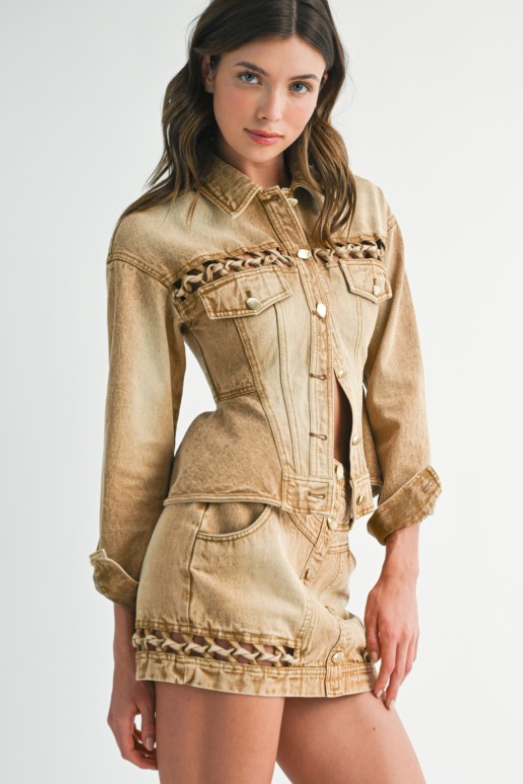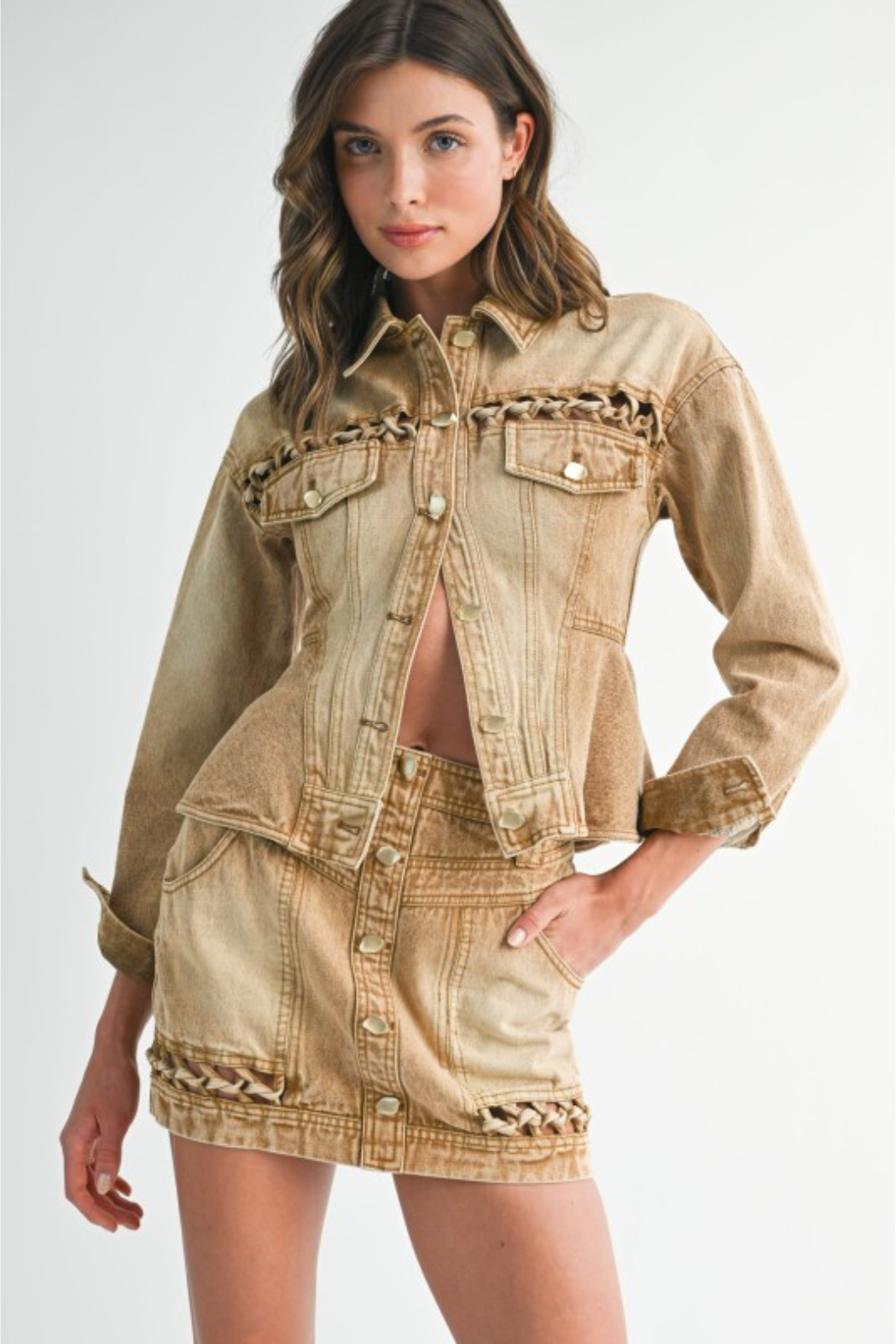 This denim jacket features a golden brown, faded wash, with a collared neckline, long sleeves, and gold button closures.