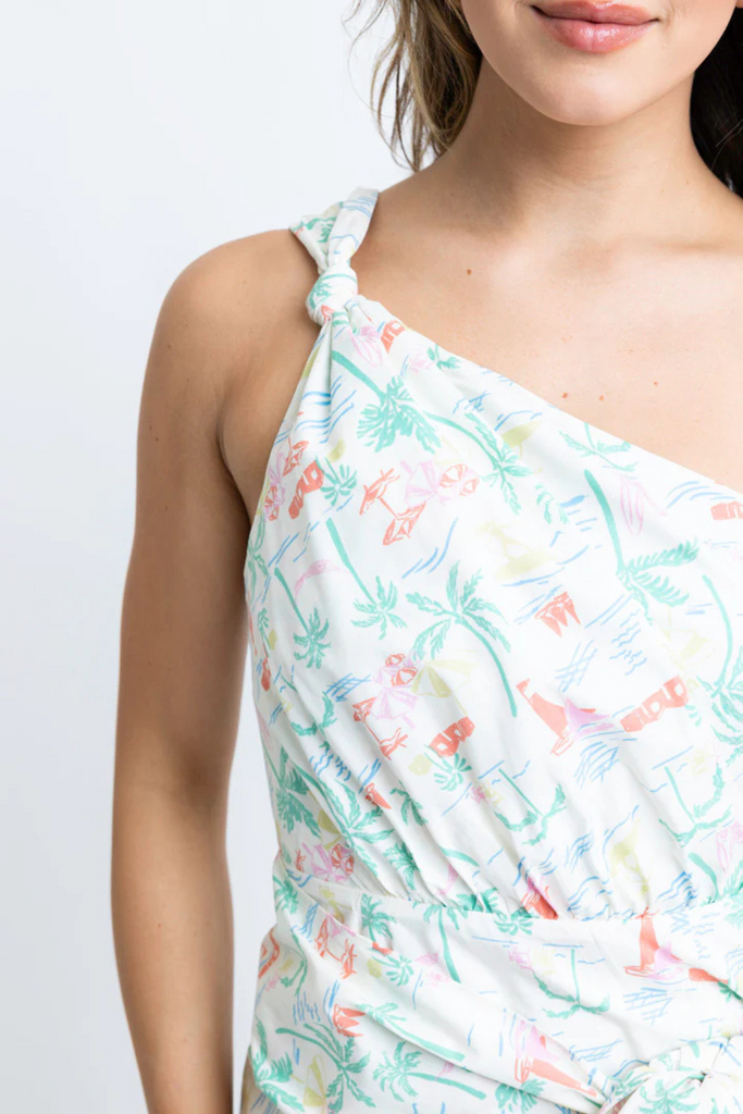 Dress to impress with our Seashore One Shoulder Dress! Featuring a zip back, knot one shoulder, and tie waist, this dress will have you looking and feeling fabulous. The fun seashore print adds a playful touch, while the flattering fit will provide a boost of confidence.Model is 5'6", wearing a small.