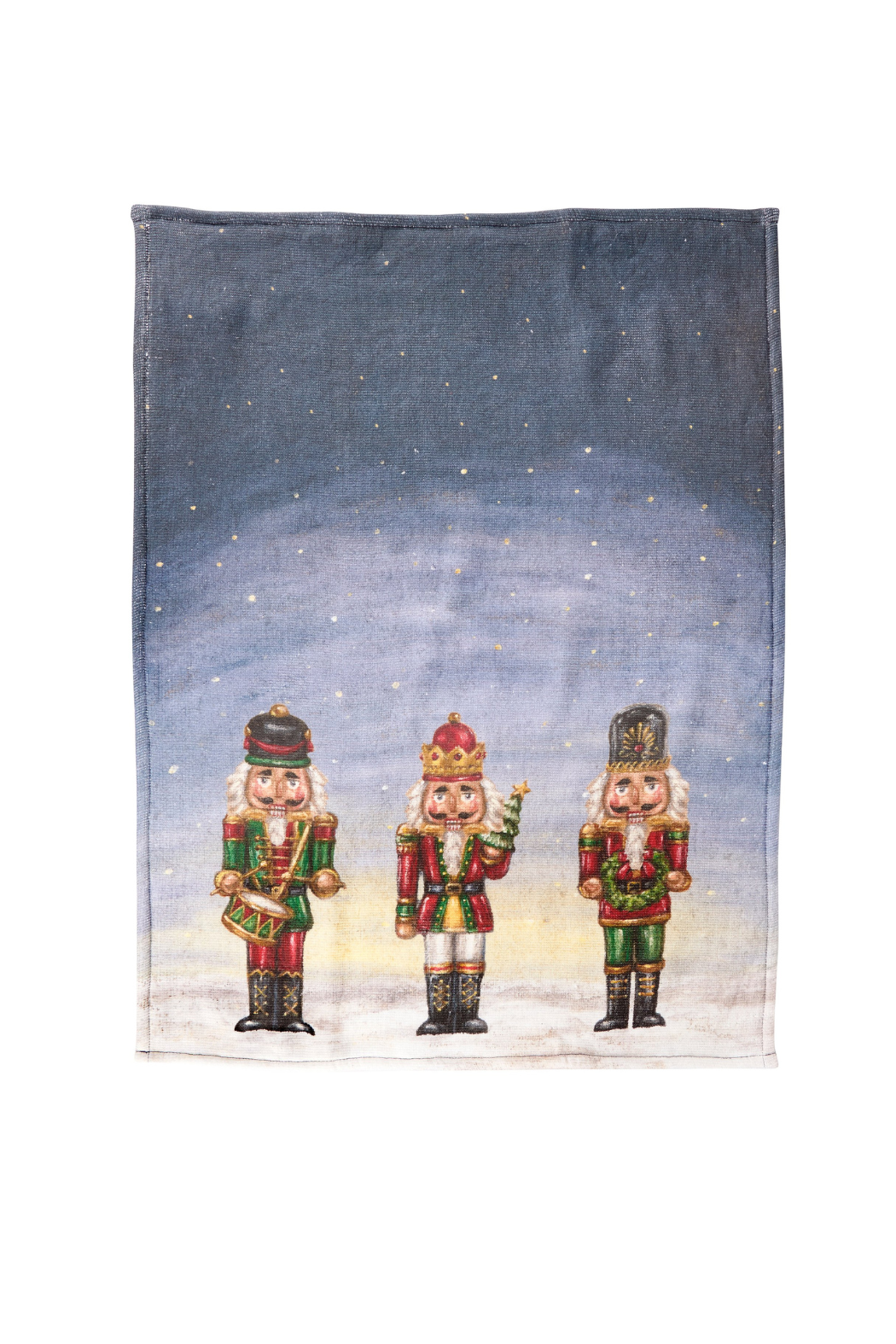A cotton kitchen towel displaying an all-over design of a snowy scene with 3 different nutcrackers posed together.