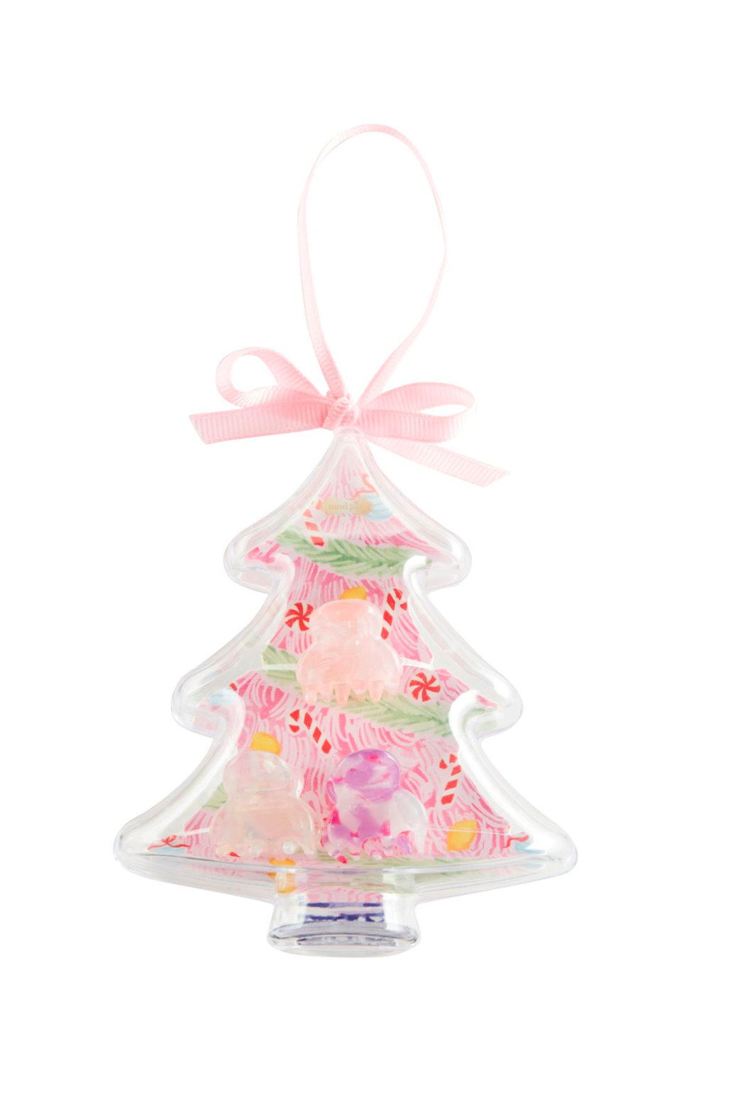 Set of three acrylic claw clips come on Christmas tree plastic ornament packaging with ribbon hanger loop.