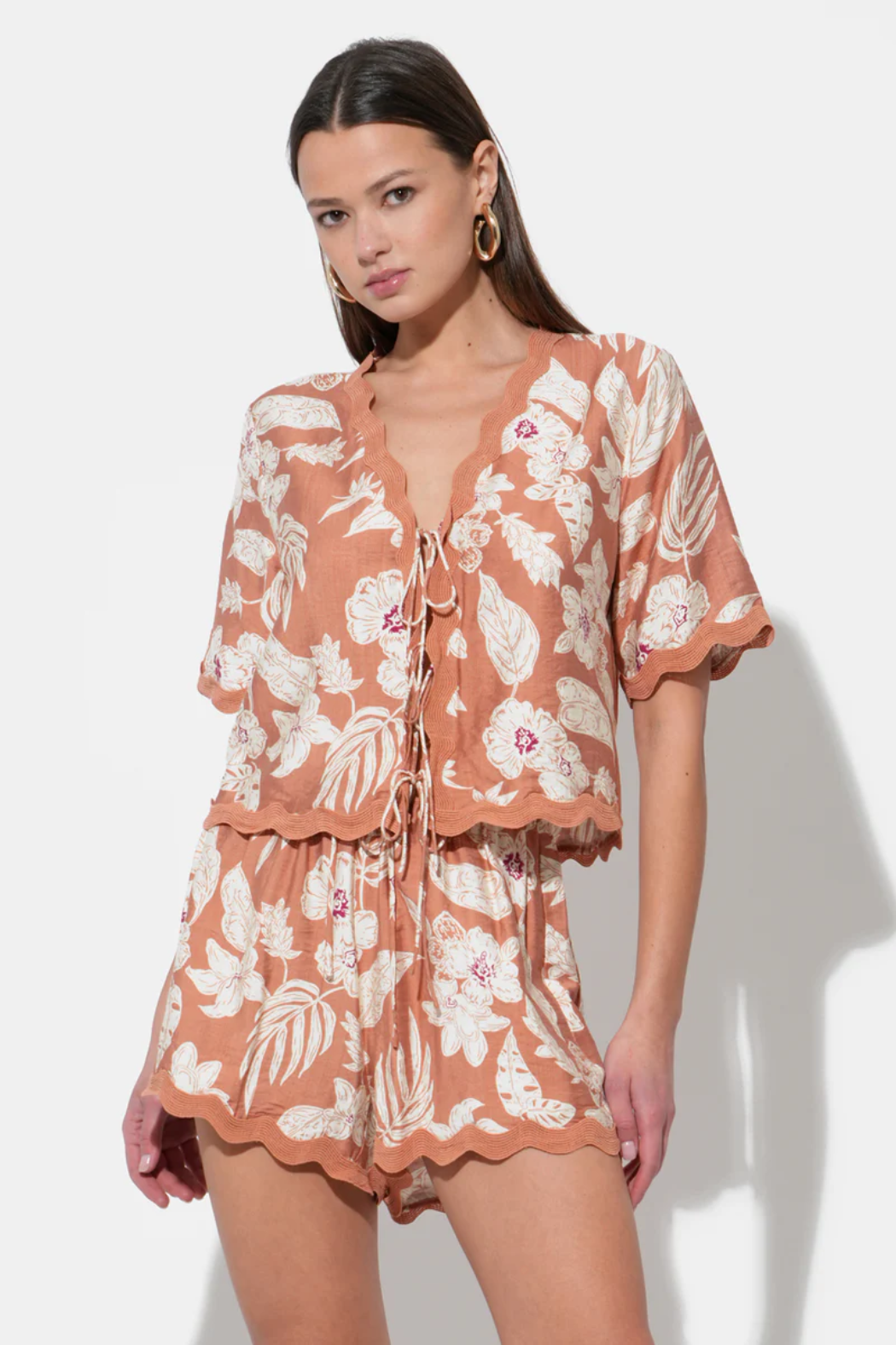 This charming top features a warm, earthy tone adorned with an elegant floral and botanical print in white and subtle pops of purple. The relaxed silhouette is enhanced by wide, flowy sleeves and a distinctive scalloped trim along the V-neckline and hem. Playful mini front ties add a touch of adjustable style, allowing for a personalized fit. Matching shorts sold separately.