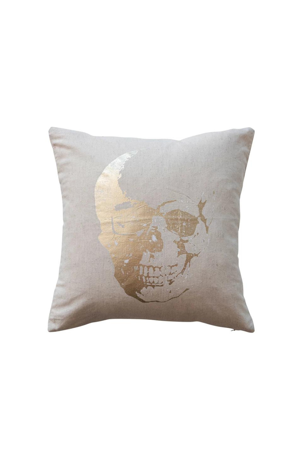 18" Square Cotton Printed Pillow w/ Skeleton Head & Gold Foil, Natural