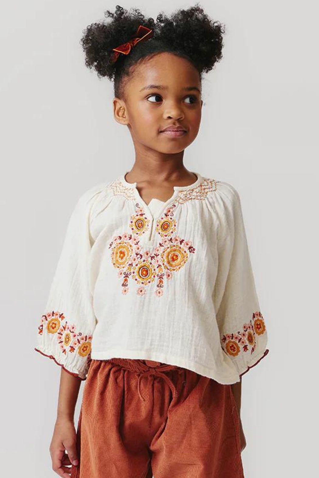 Brilliantly Boho! Our Girls Ava Top in Cream with Harvest Embroidery features a gorgeous swirling floral pattern sewn to perfection in Fall's warmest color palette. Embroidered smocking at the neck, a hook an eye closure at the v-neck for a little extra coverage, and a flowy 3/4 puff sleeve will attract your little daydream believer.