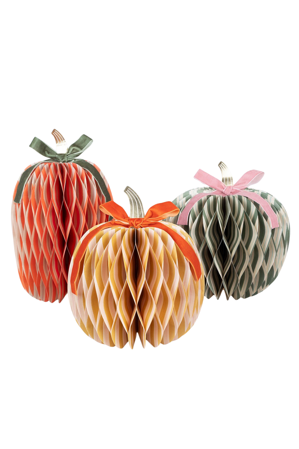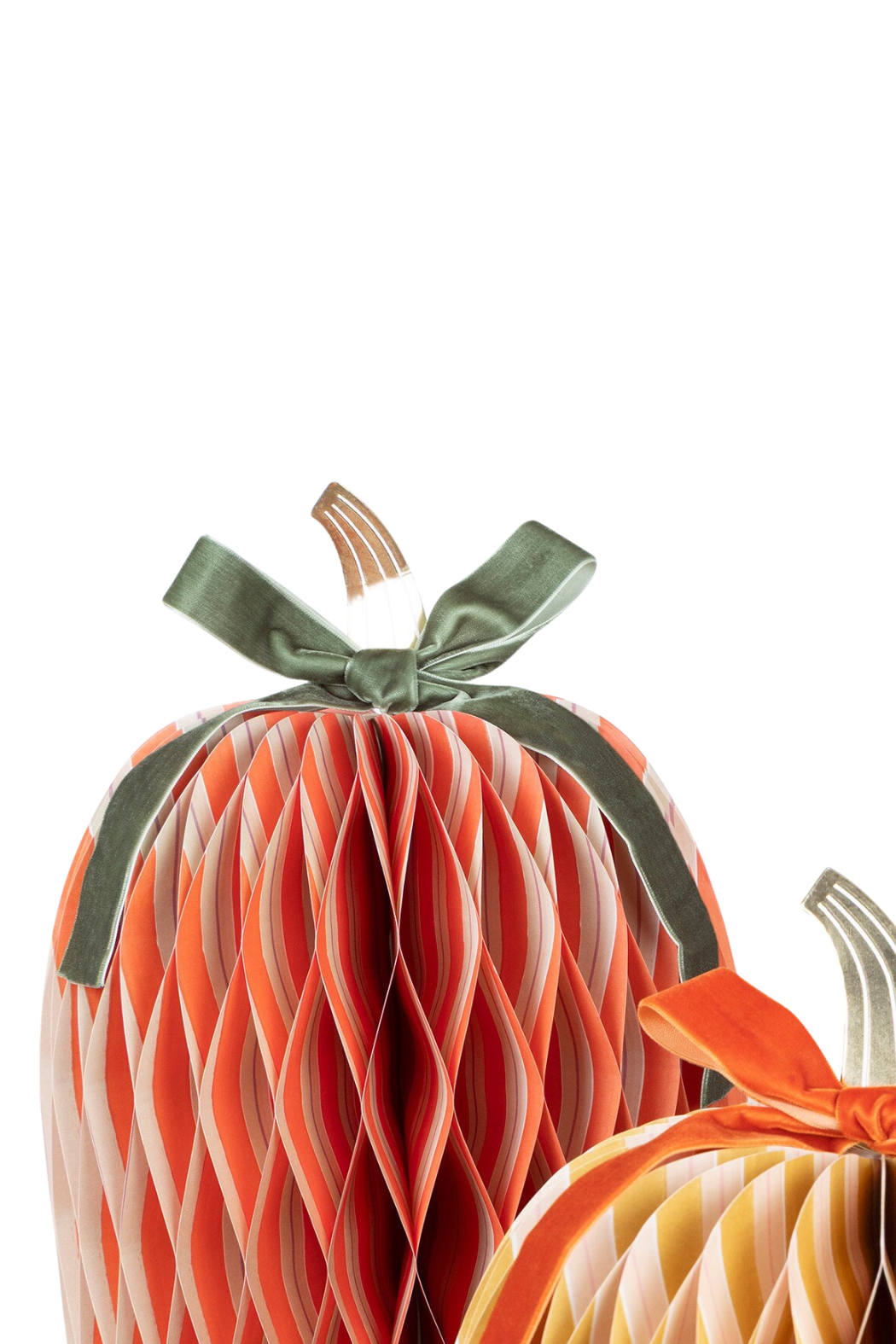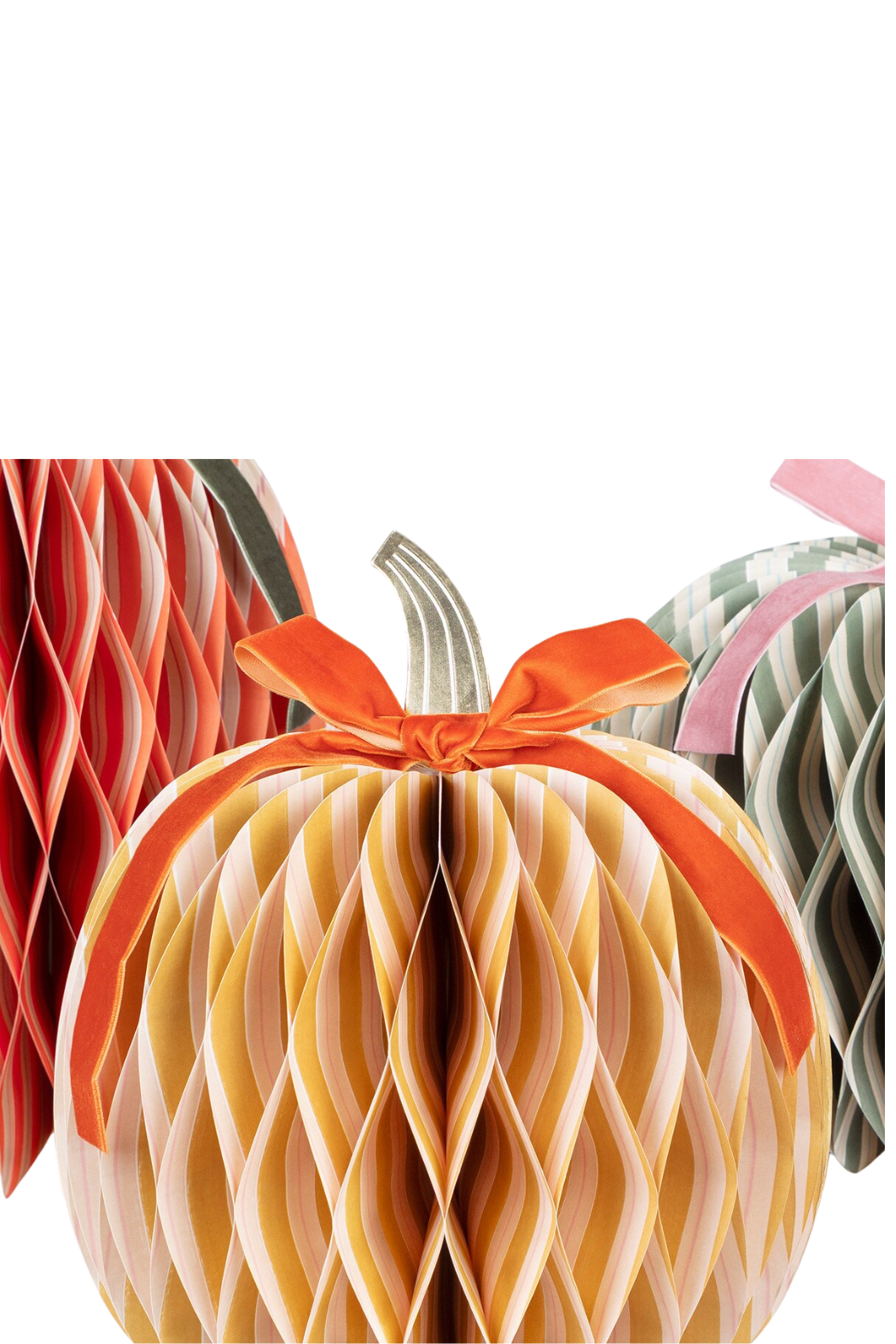 Add a cosy yet stylish touch to your fall and Thanksgiving decor with these striped honeycomb paper pumpkins.