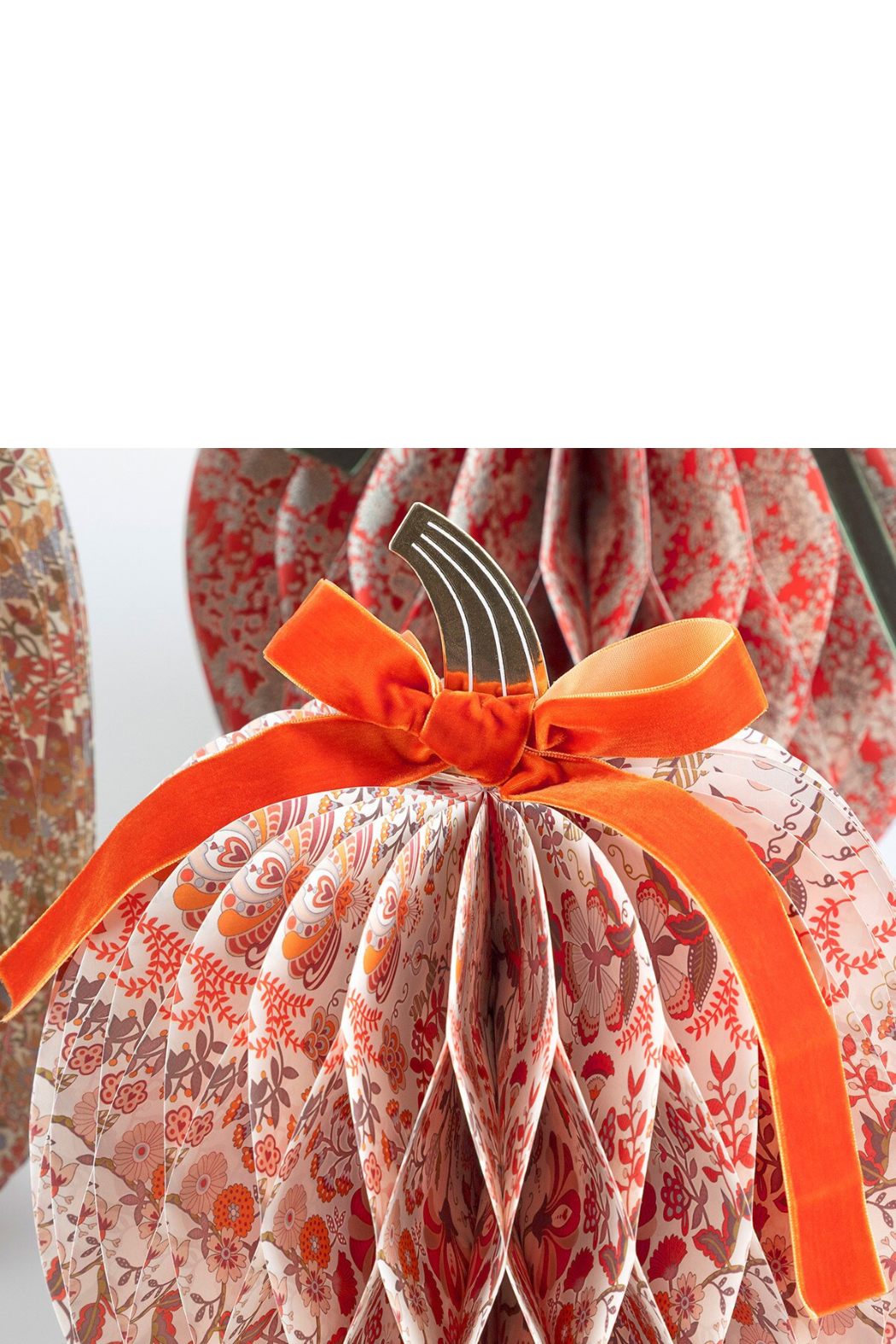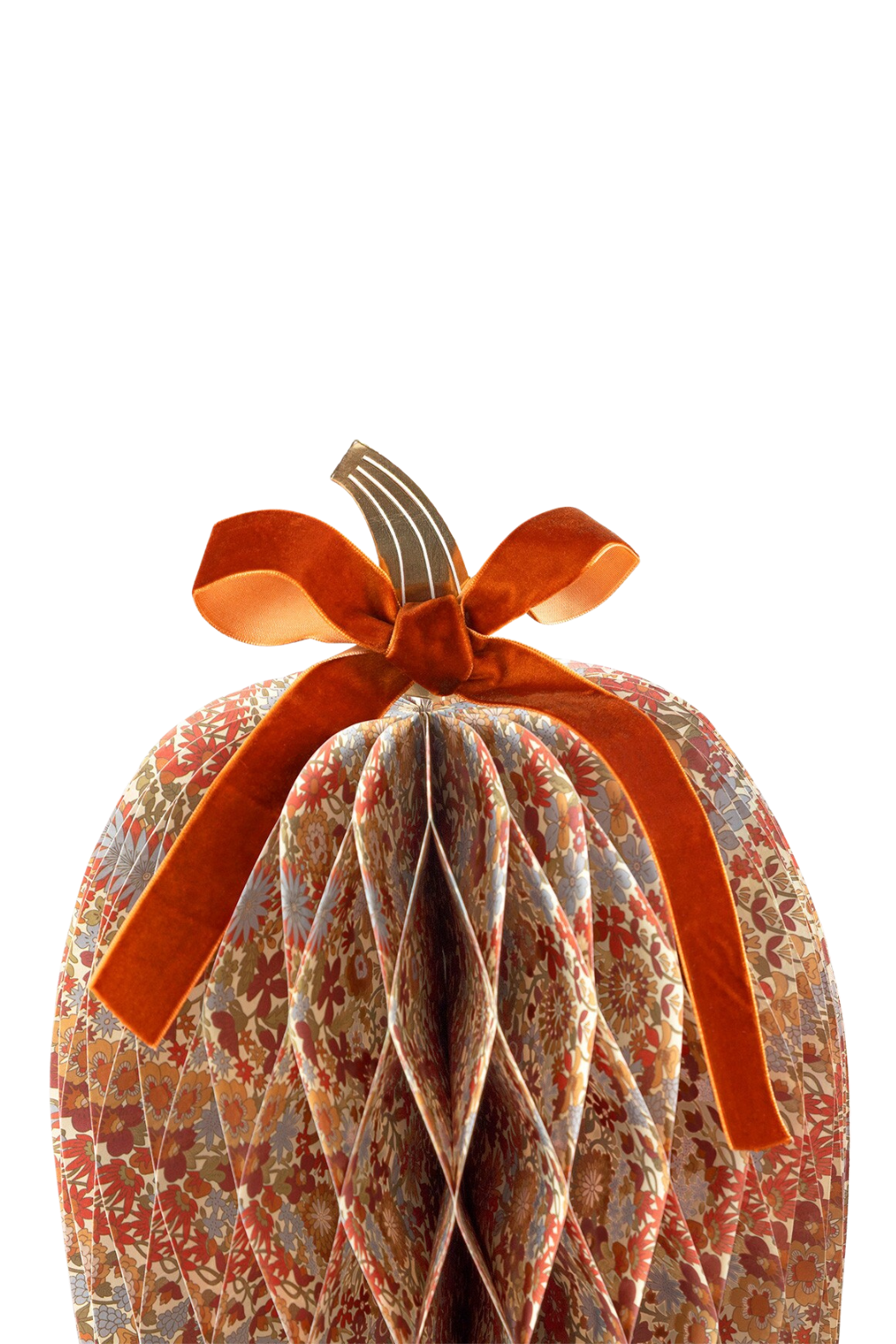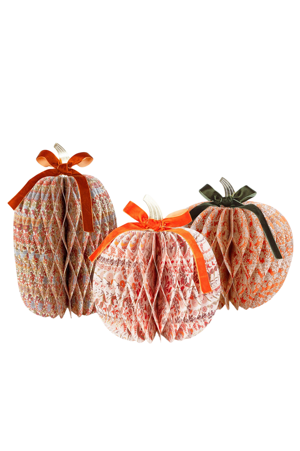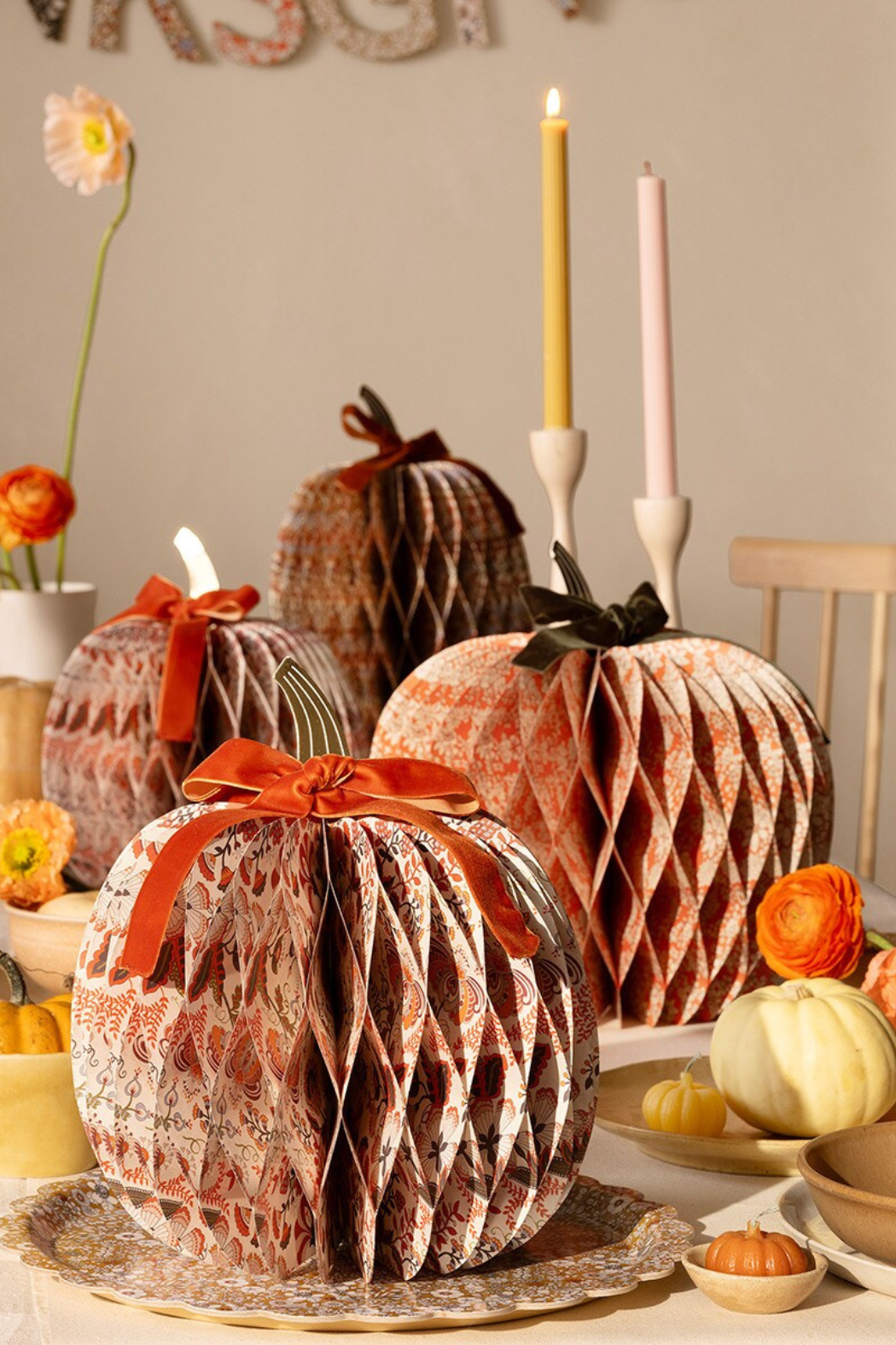 These stylish 3D honeycomb paper pumpkins, featuring Liberty floral prints and soft velvet bows in warm hues, create a look that's both charming and sophisticated.