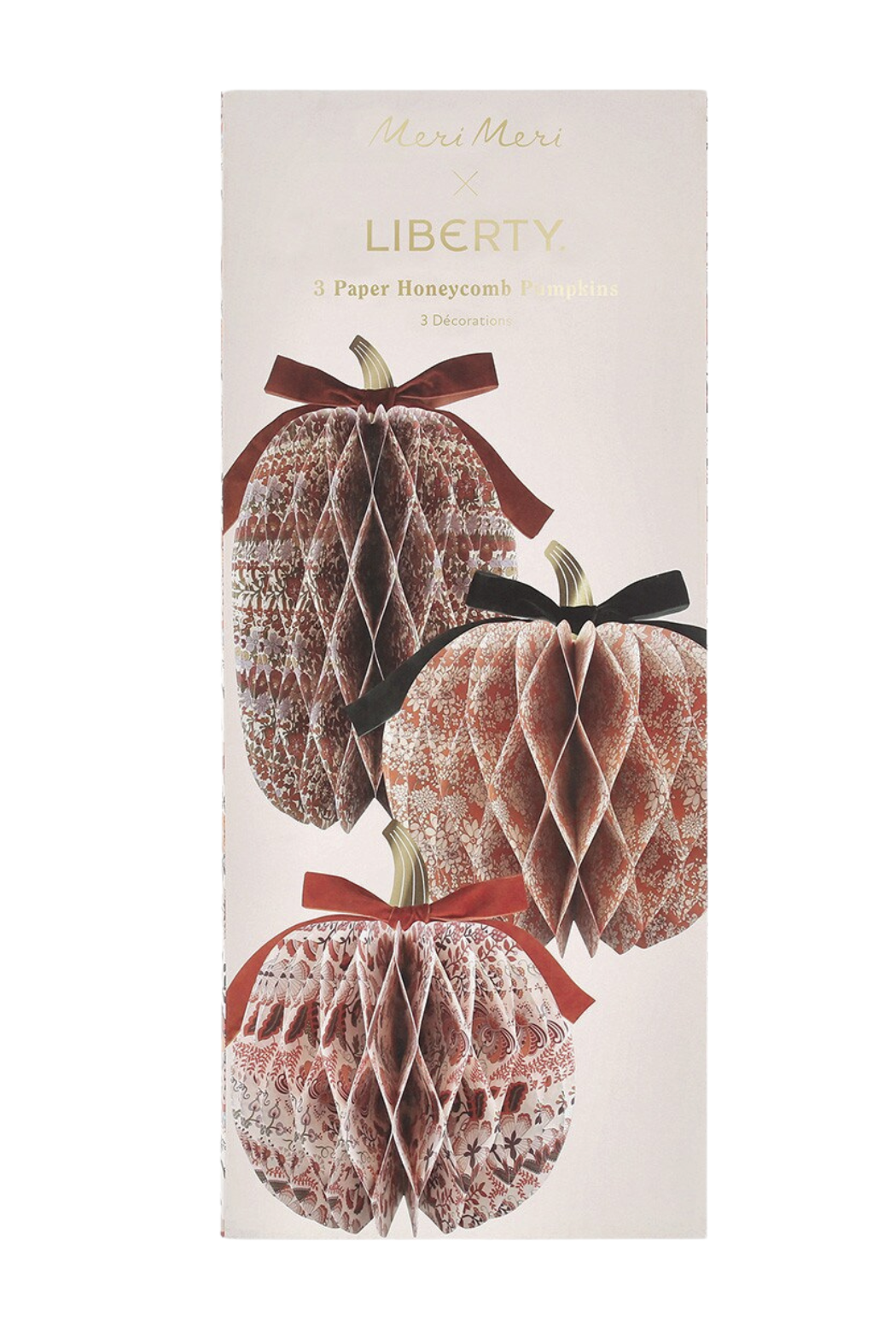 3 Honeycomb paper pumpkins, each with a different Liberty floral print and velvet bow in warm hues