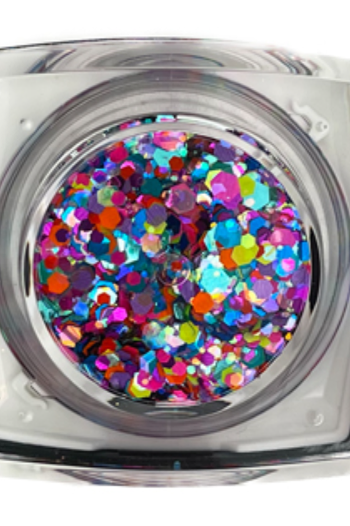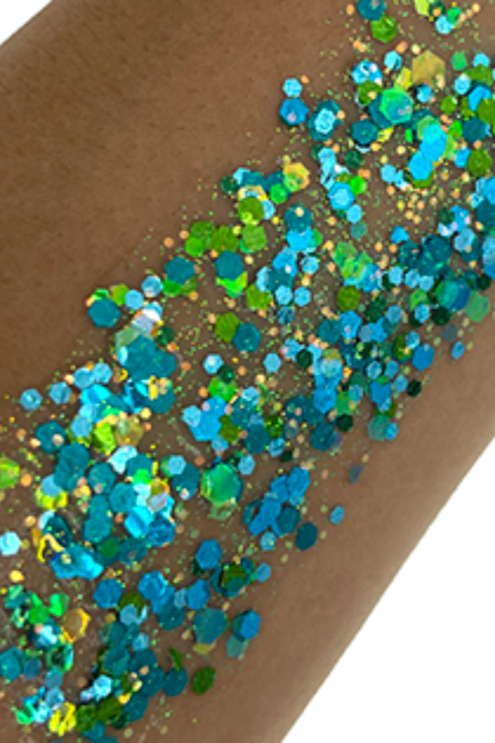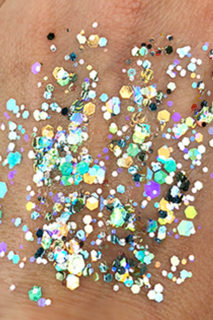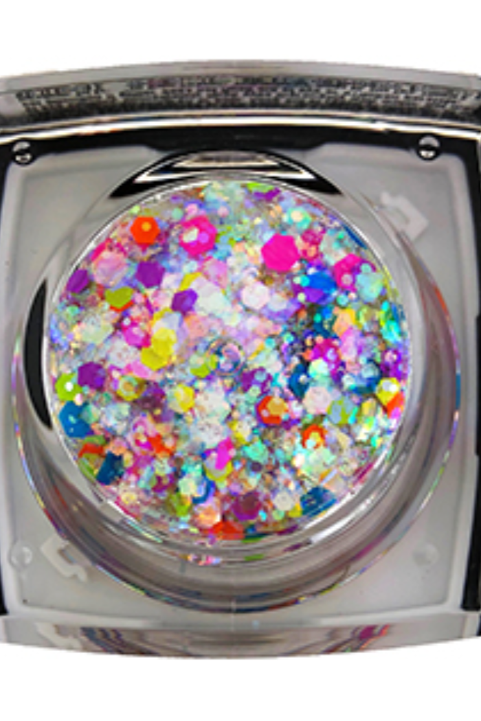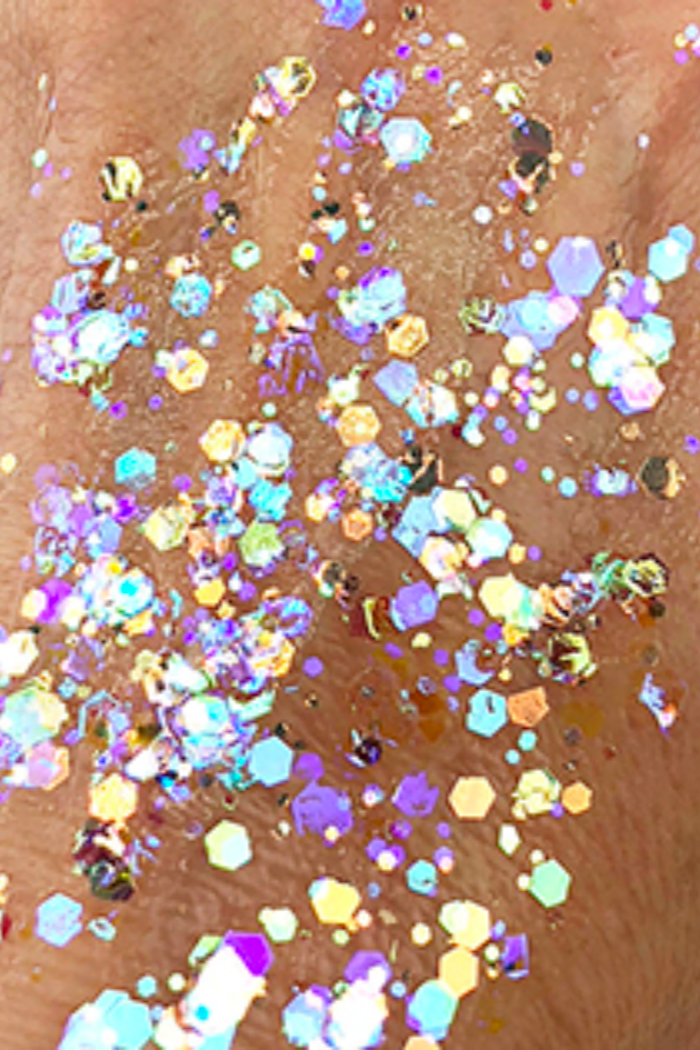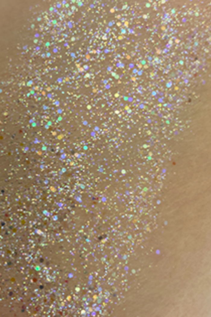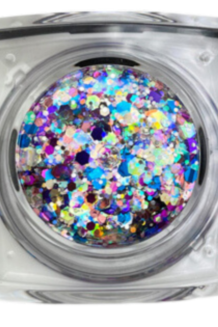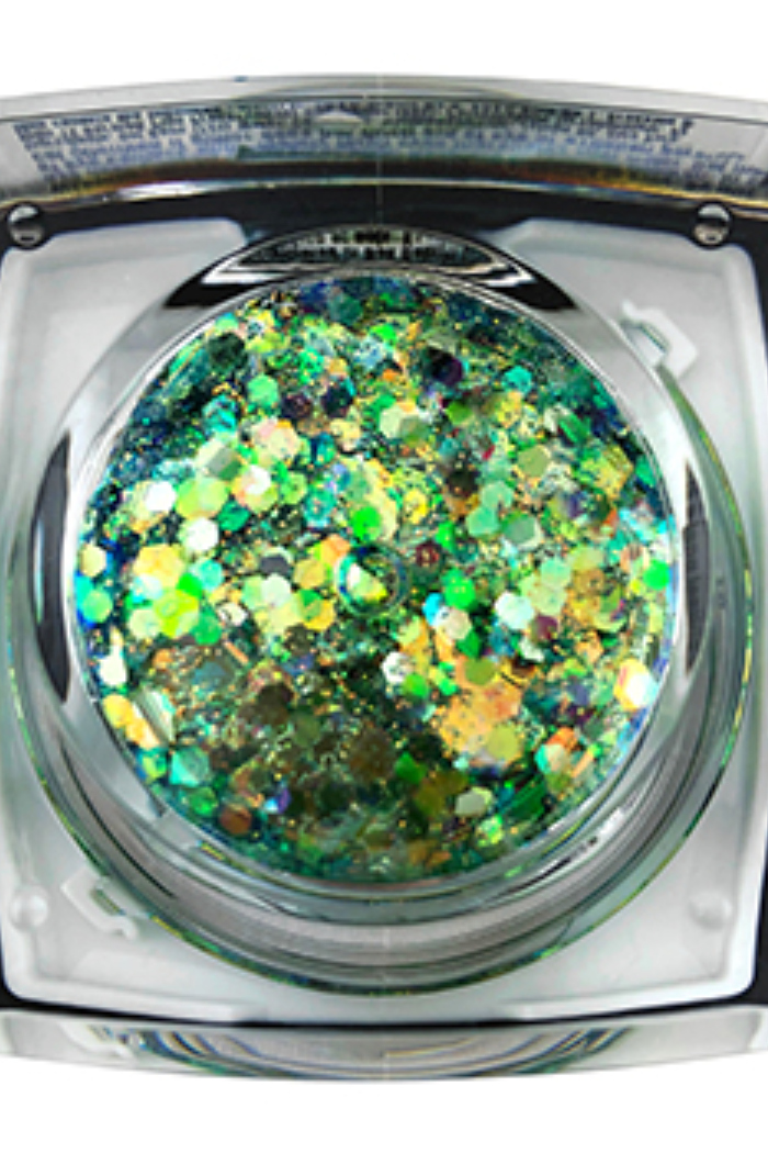 Elektra Cosmetics Bolt Balm is an intense blend of chunky and fine glitters custom mixed in an aloe vera gel base. It’s perfect for hair, body, face, or highlight but is NOT eyelid safe.
