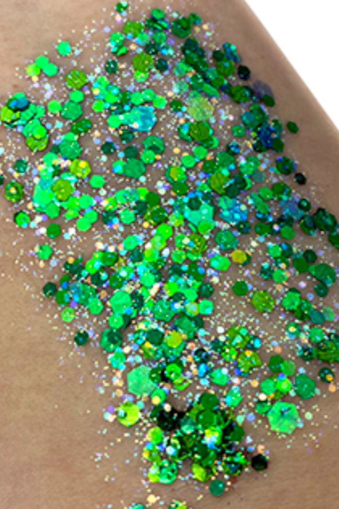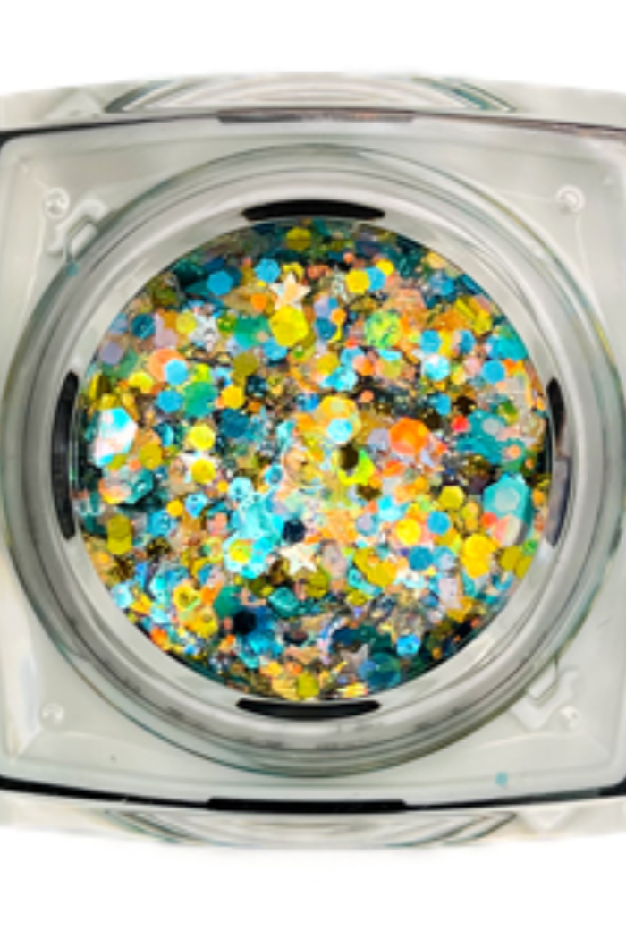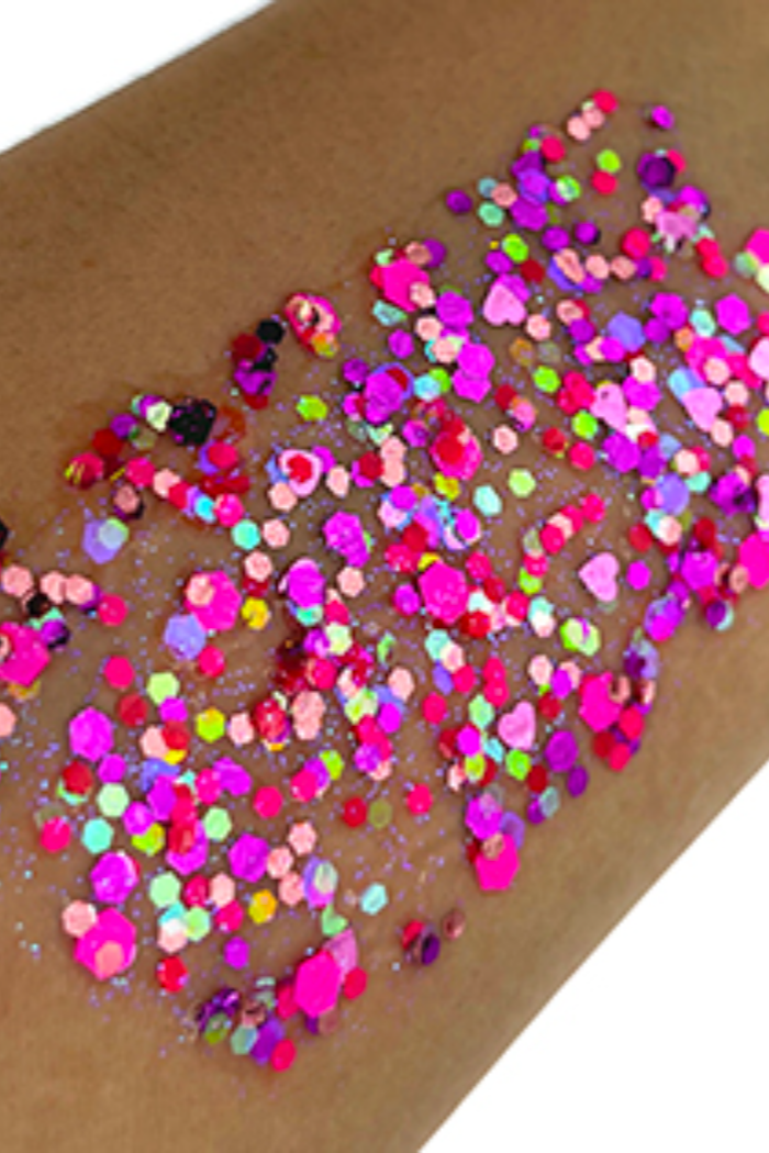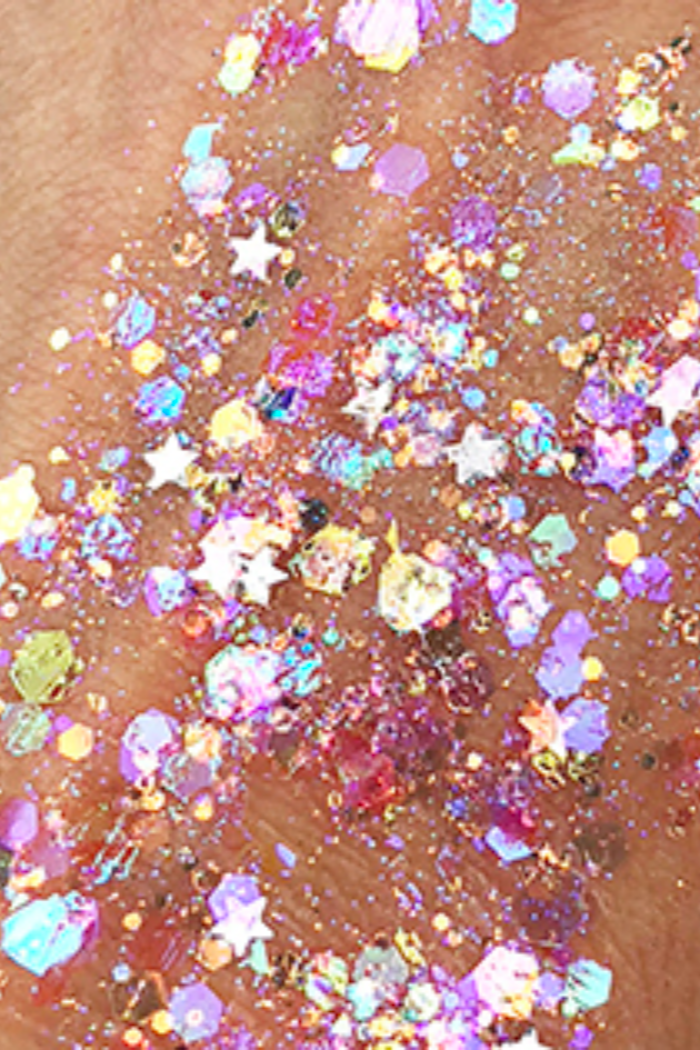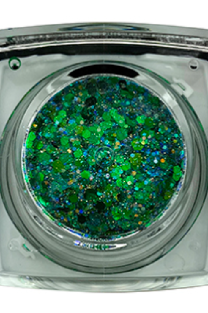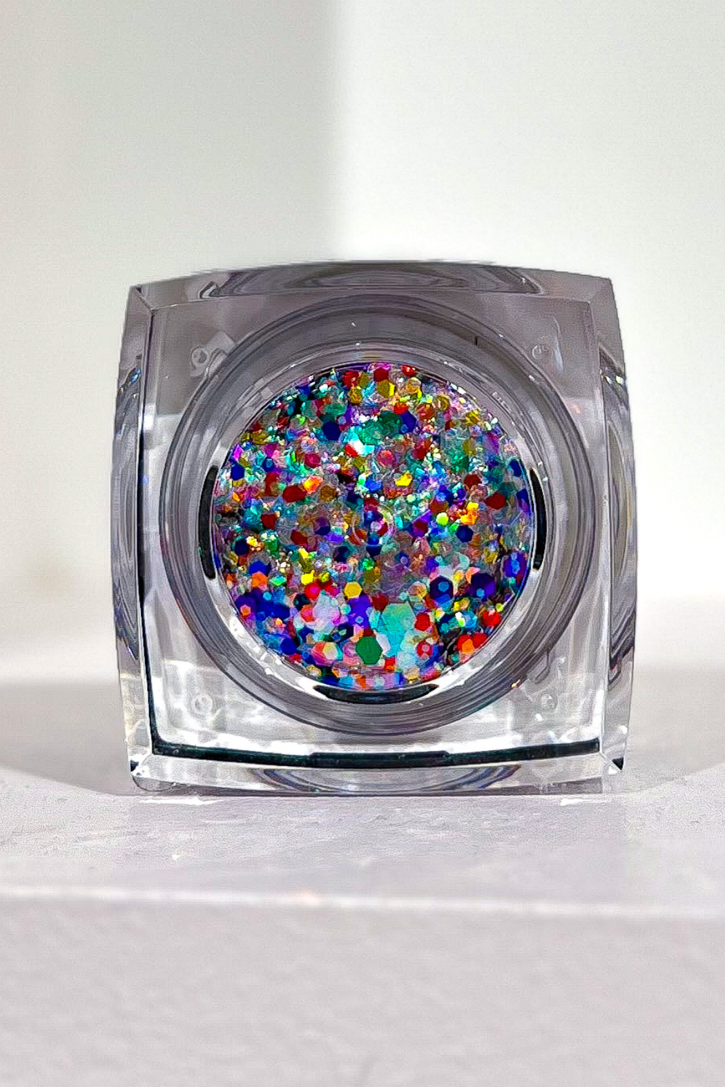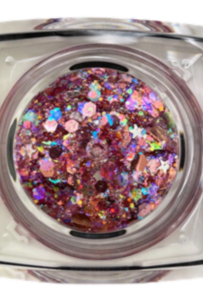 Elektra Cosmetics Bolt Balm is an intense blend of chunky and fine glitters custom mixed in an aloe vera gel base. It’s perfect for hair, body, face, or highlight but is NOT eyelid safe.