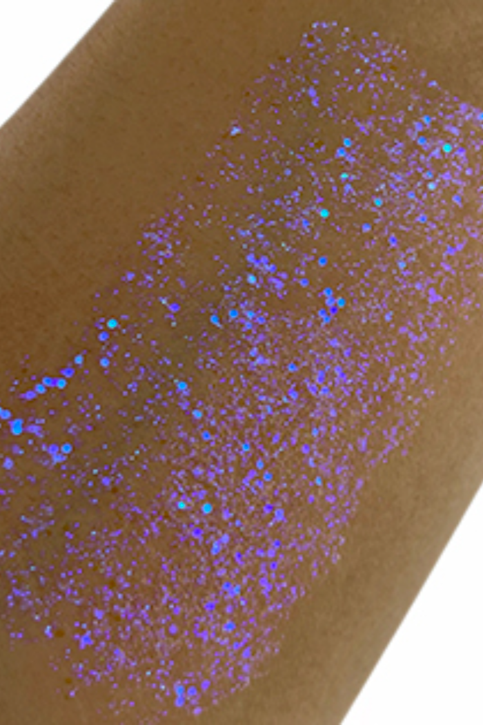 To get the ultimate sparkle, Bolt Balm can be layered over a Body Shimmer or you can dab on additional Elektra Microfine glitter while the gel is still wet.