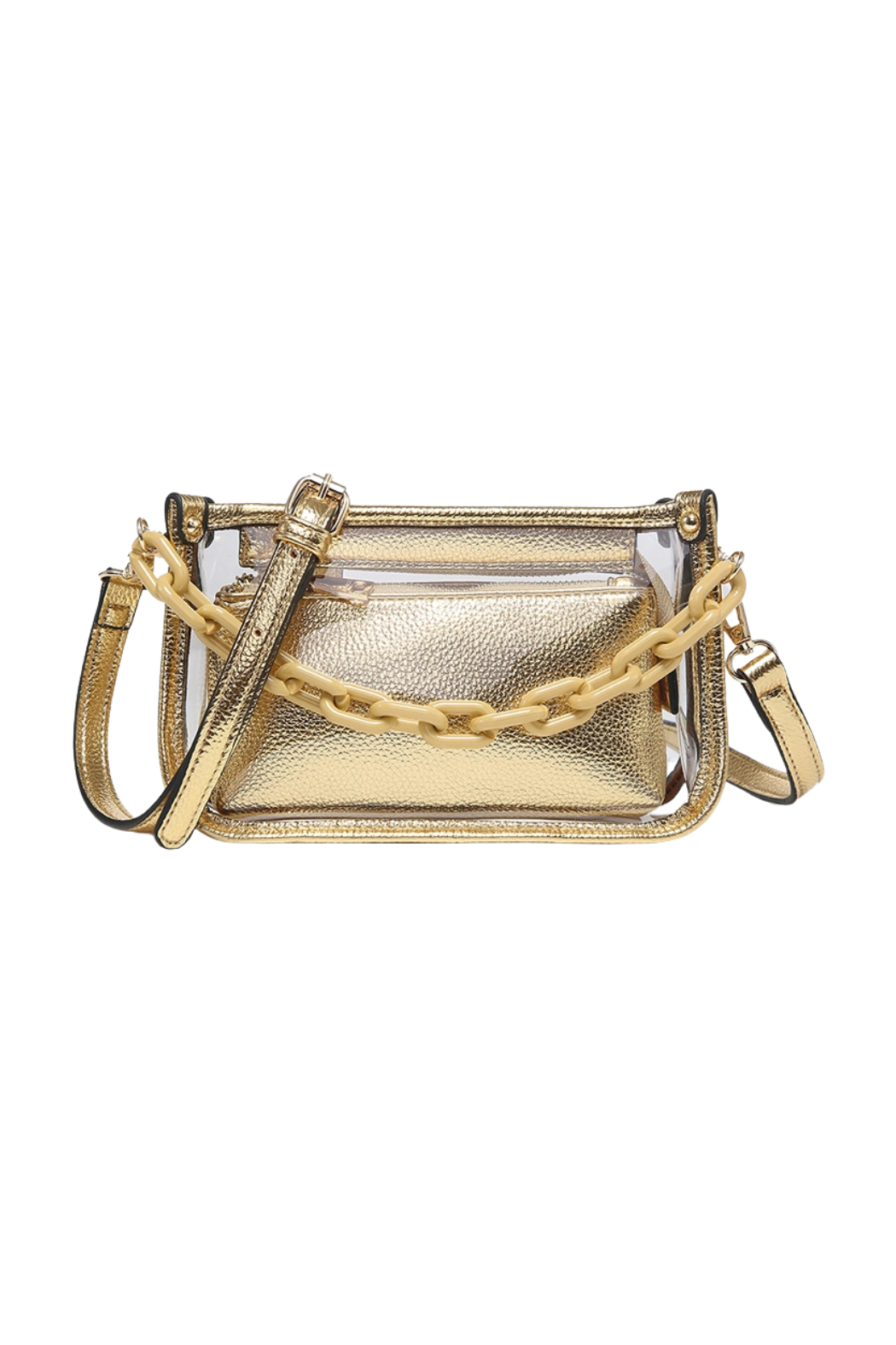 The Jessica Clear Crossbody with Chain is a stylish game day essential. Its clear design meets stadium regulations, and the removable chain strap lets you switch between a crossbody or a clutch, offering versatility and modern style for any game day or everyday occasion.
