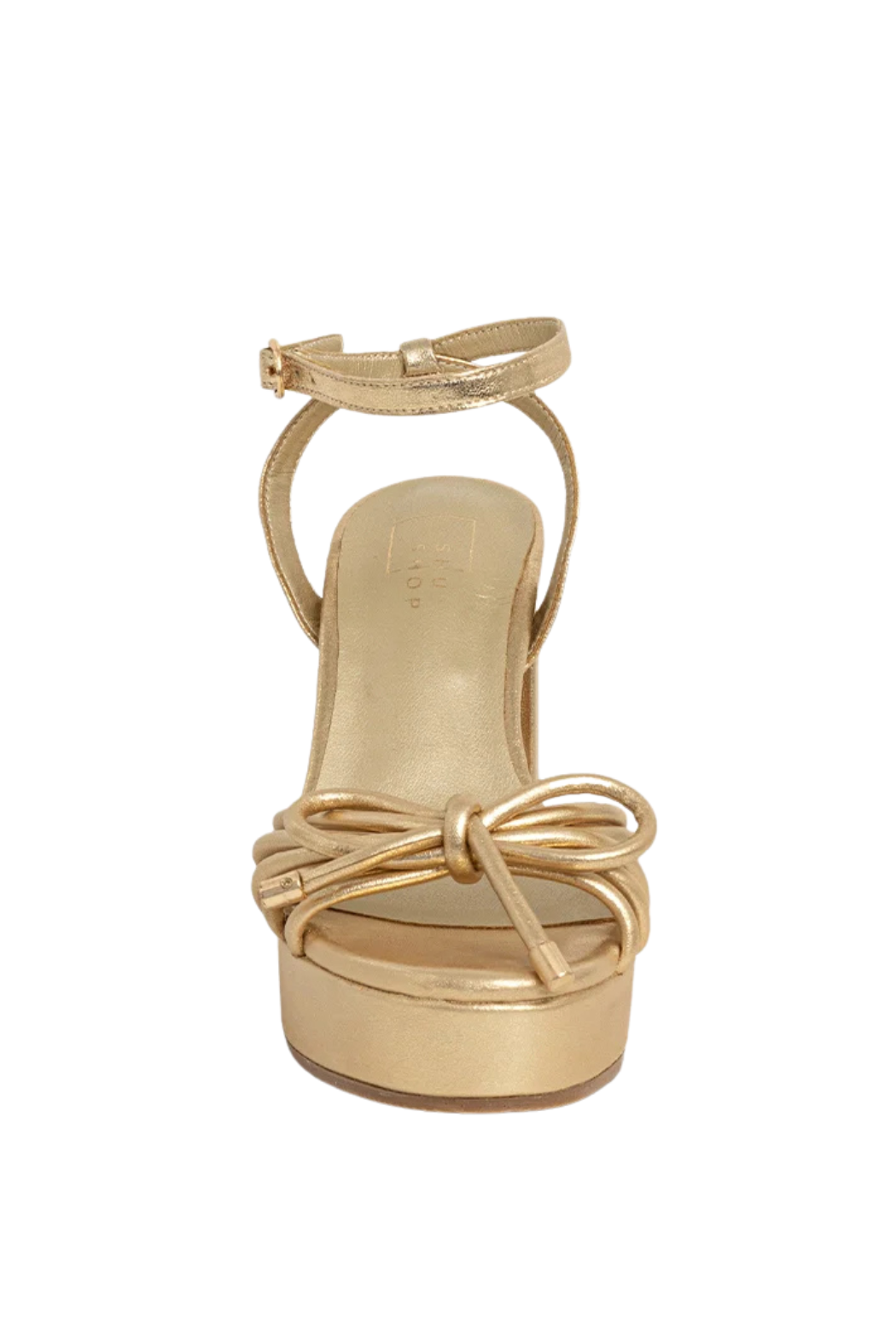 Your golden-hour go-to. The EDITH in Gold brings radiant shine and modern edge to a retro-inspired silhouette. With glimmering faux metallic leather, a knotted strap design, and a bold block heel, this platform sandal was made for making an entrance. From weddings to weekend parties, this heel is the sparkle your outfit’s been waiting for. Shine bright, walk tall.