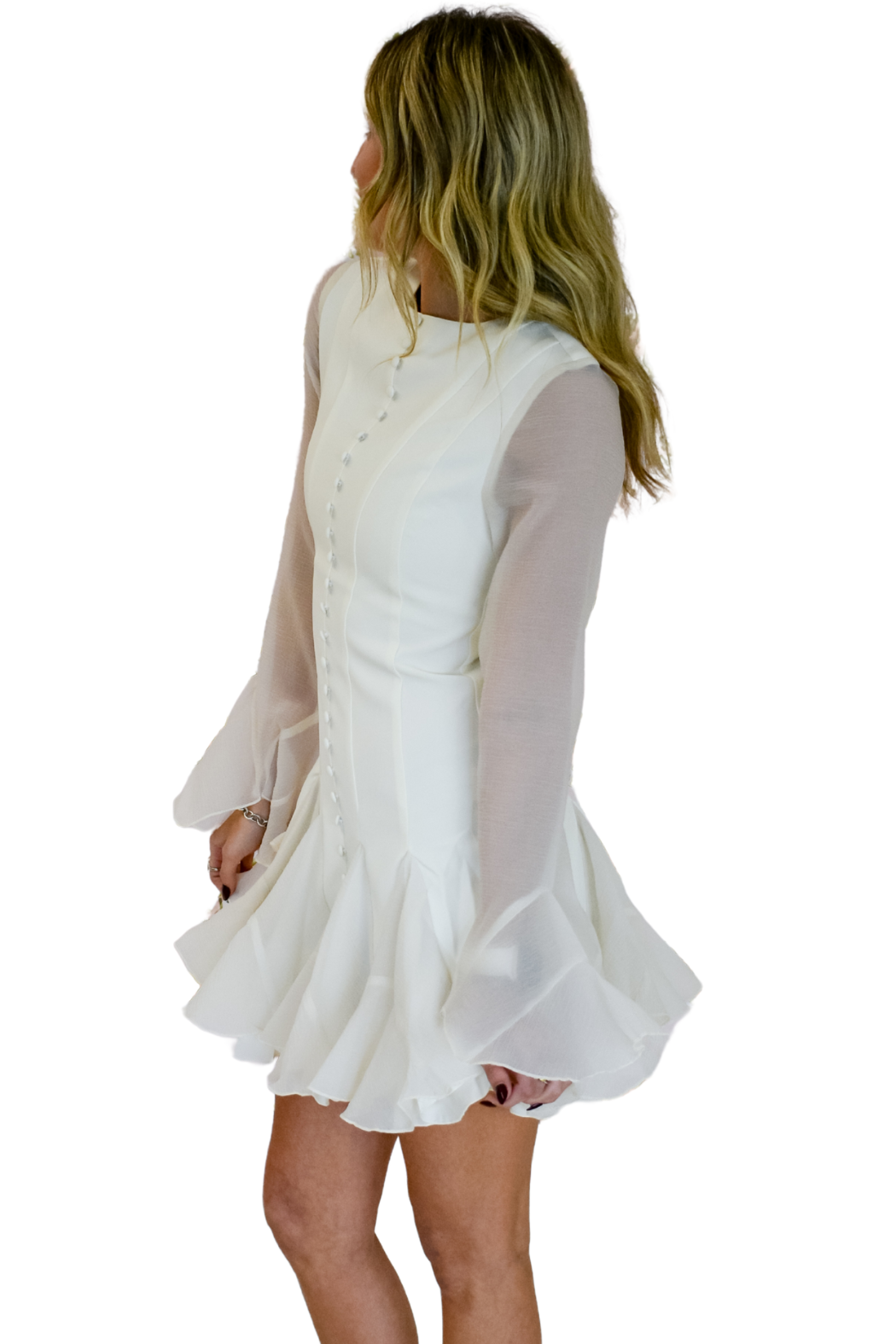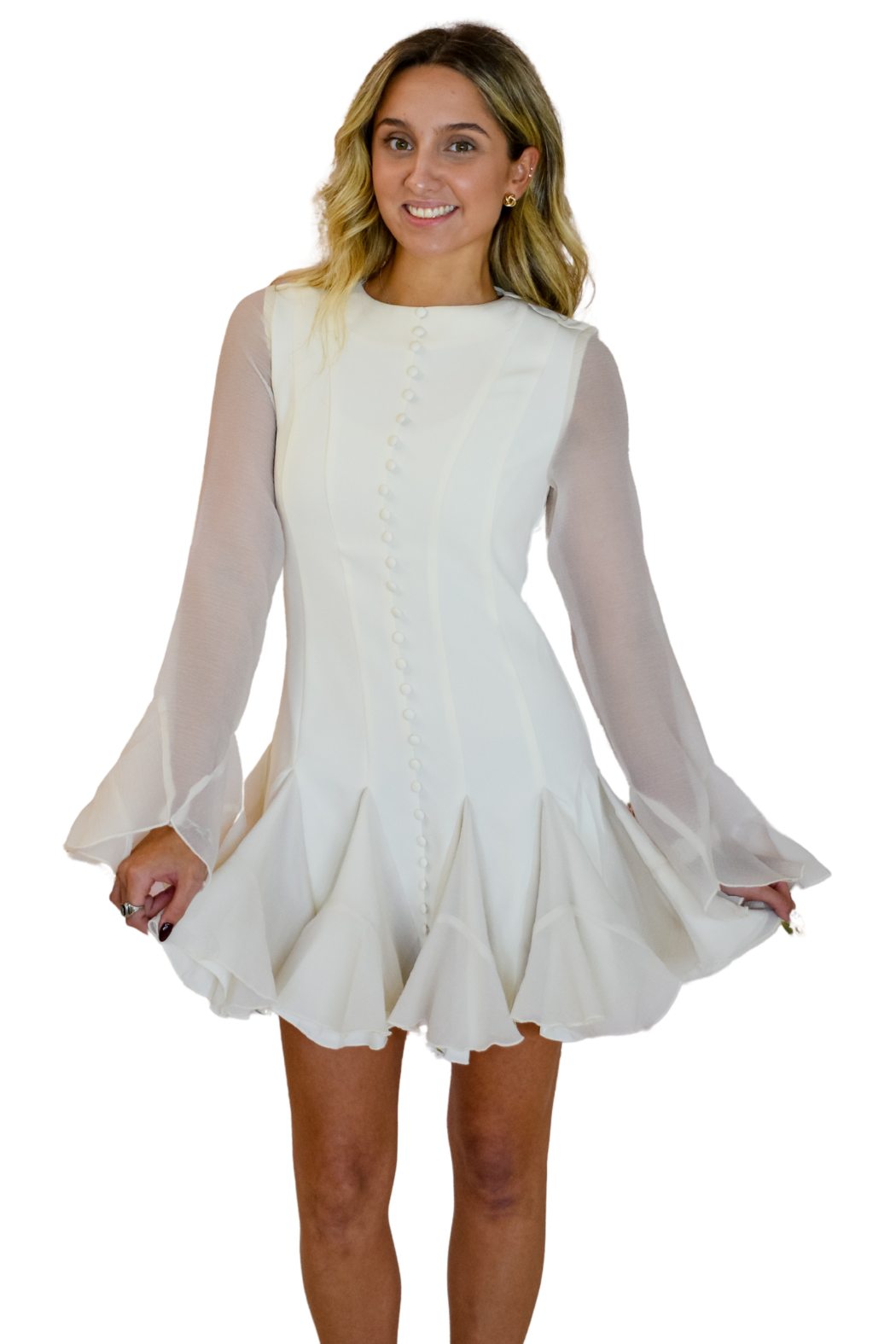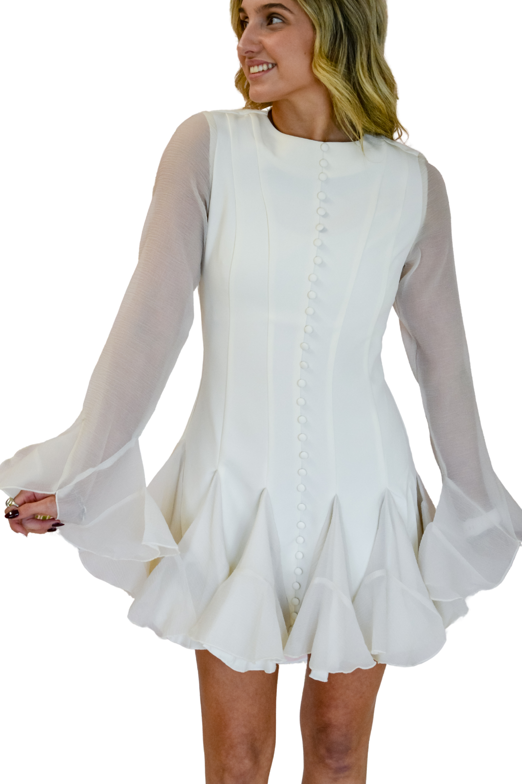 This white long-sleeve mini dress features sheer chiffon bell sleeves and a fitted bodice with vertical seaming for a flattering silhouette. The front is detailed with a row of covered buttons, adding a classic touch. The skirt is finished with a flared ruffle hem, creating soft movement.