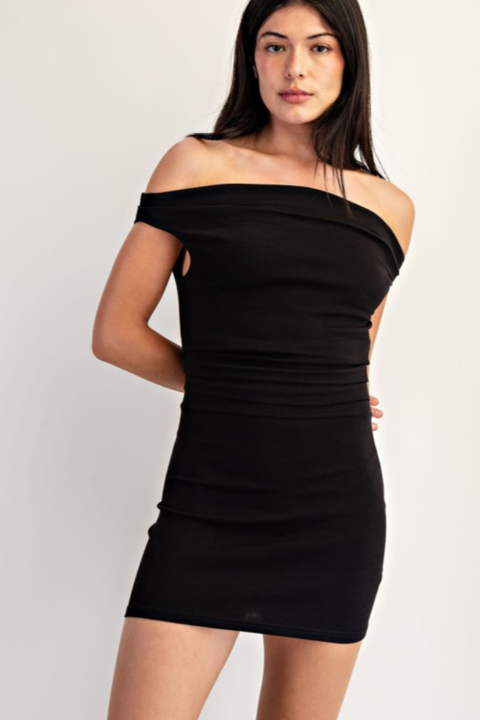 Elevate your night-out wardrobe with this sleek off shoulder mini dress. Designed with a flattering bodycon fit and ruched detailing that enhances curves, this solid black piece is both versatile and effortlessly stylish. The soft stretch fabric ensures comfort while the off-shoulder neckline adds a touch of elegance. Perfect for clubbing, parties, or date nights.