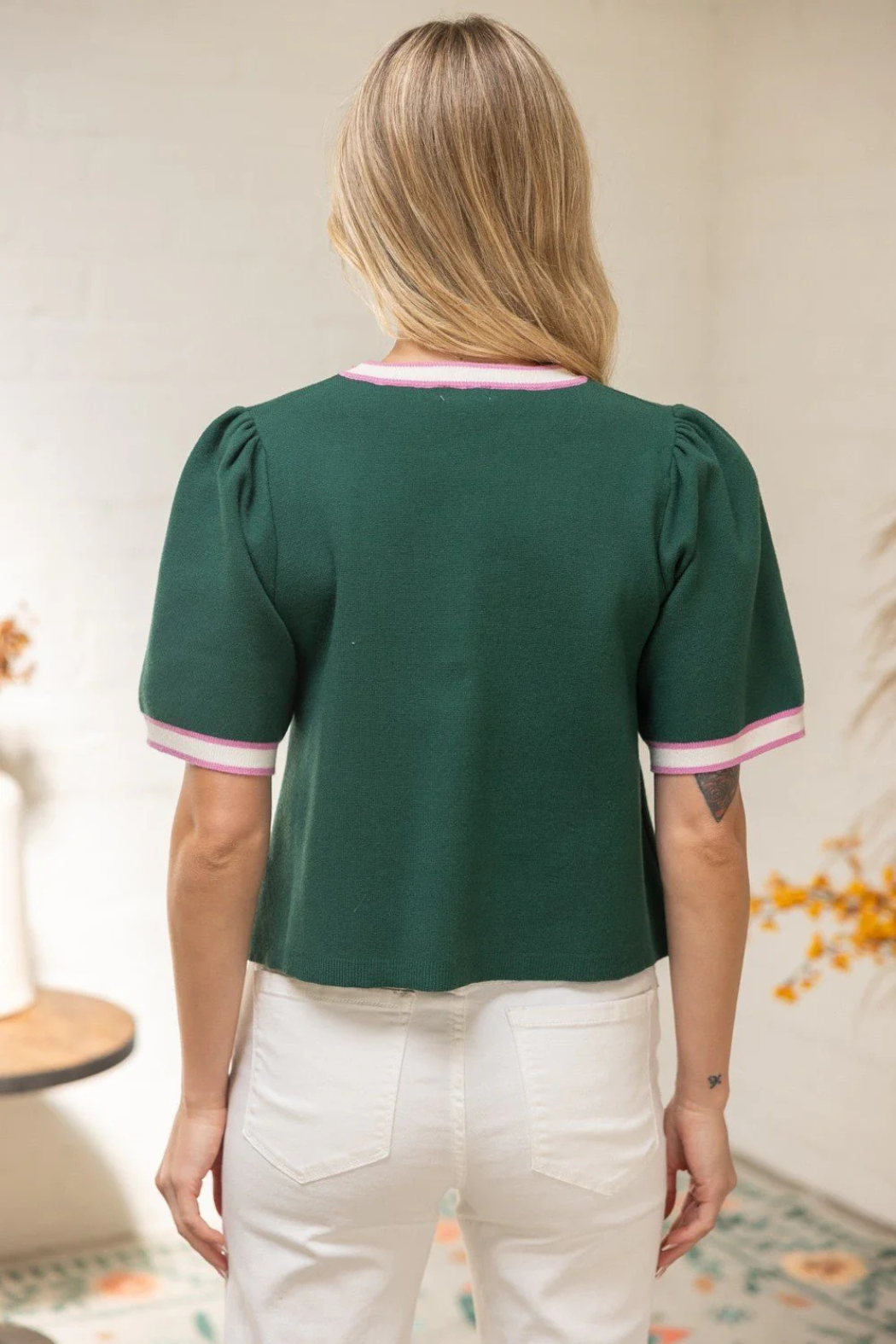 Add playful polish to your wardrobe with the Scallop & Gold Button Detailed Knit Top. This statement knit features a soft, structured silhouette with puff short sleeves and eye-catching scallop trim accented by gold buttons. Pink contrast detailing at the neckline and cuffs adds a fun, feminine twist. Perfect for dressing up denim or pairing with tailored trousers. True to size.