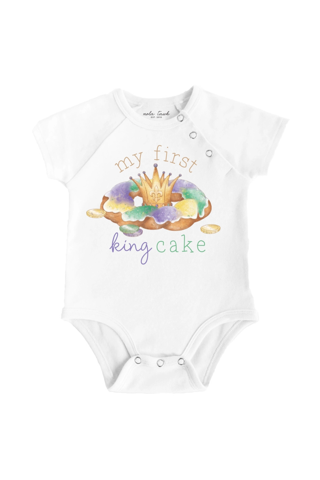 Our 'My First King Cake' organic cotton baby onesies are the perfect accessory for your baby to try their first sweet Mardi Gras treat!