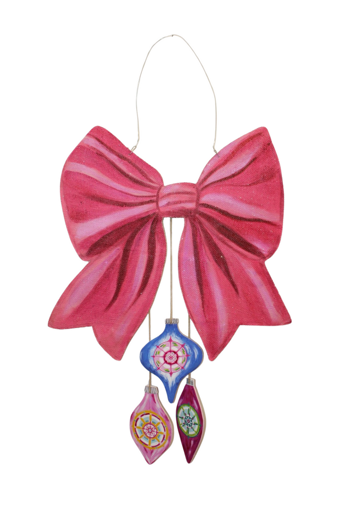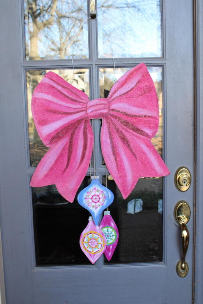 22x21" Handpainted Door Décor, Bow w Hanging Ornaments, Glittered ©Haley Bush