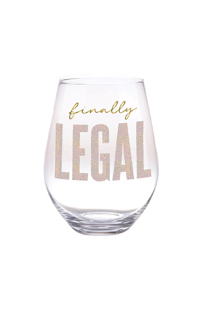 Finally Legal! Celebrate finally turning 21 and being officially legal with this jumbo stemless wine glass. Extra large size holds a full bottle of wine! Yes, we're serious!