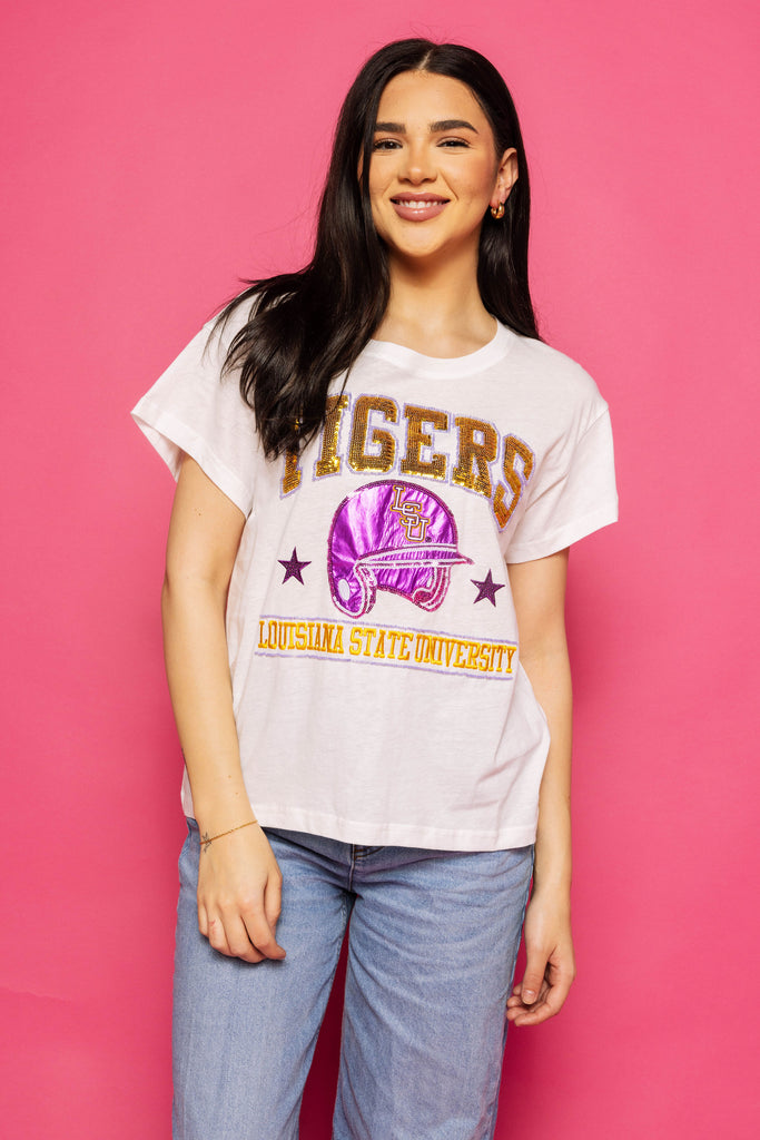 Short sleeve crew neck tee with LSU baseball helmet and designs on front