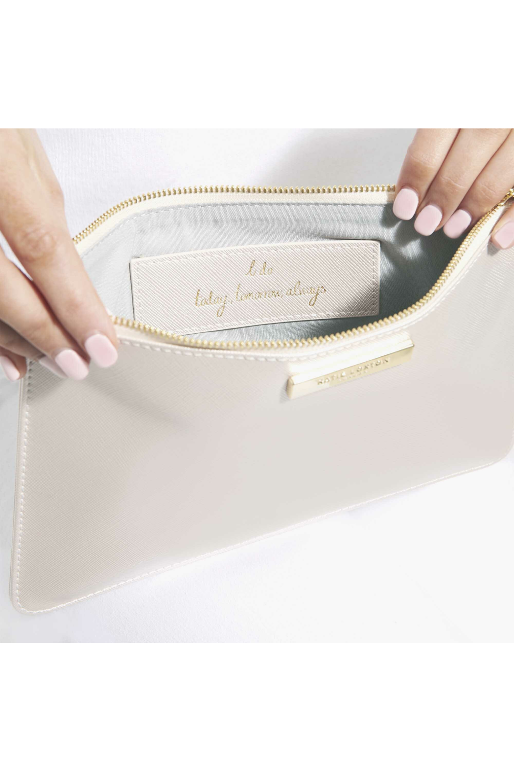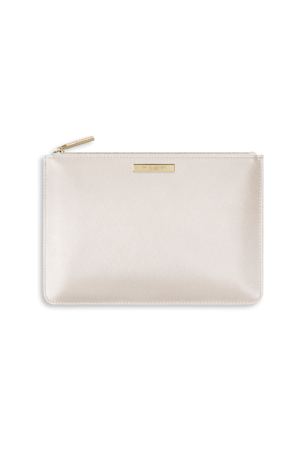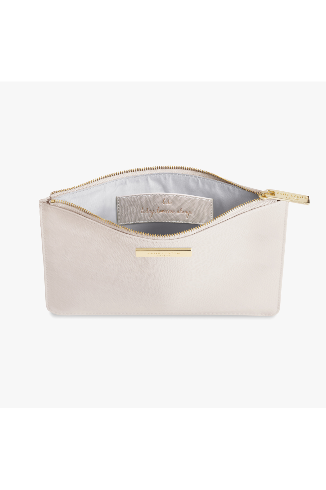 The perfect keepsake of the bride's big day. This pearly white Perfect Pouch is complete with a hidden sentiment on the inside, "I do, today tomorrow always" to always carry a little reminder of the perfect day close by. Finished in the most beautiful pearlescent luster, this softly shimmering pouch has the palest pink and champagne undertones.