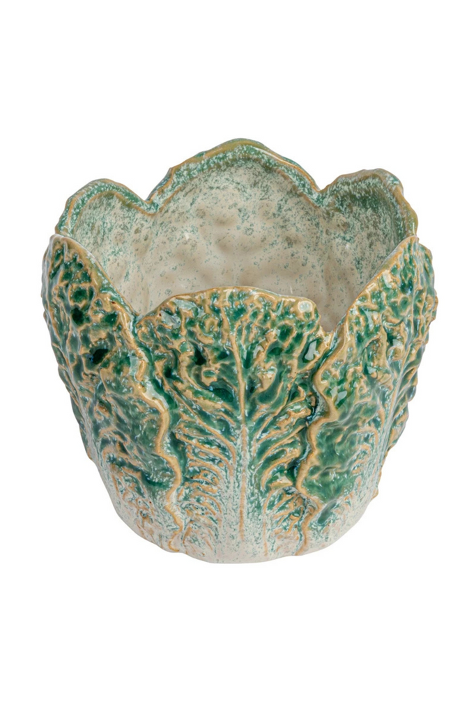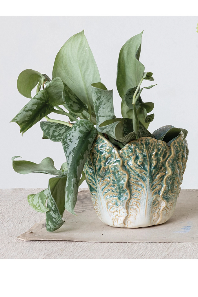 Add some charm and color to the space with this Embossed Stoneware Cabbage Planter, Reactive Glaze, Green.