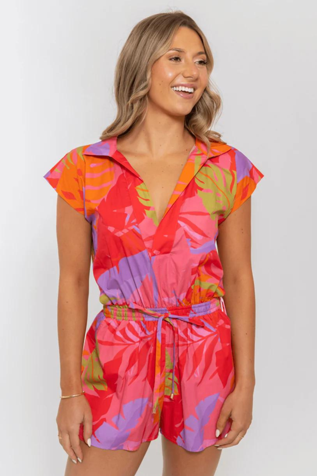 he Tropical Palm Vneck Romper is a fun and flattering choice for any occasion. This romper features a floral print, tie waist, and pockets, all of which combine to create a look that is both stylish and comfortable. Whether you’re going out with friends or enjoying a day at the beach, this romper is sure to be a hit.