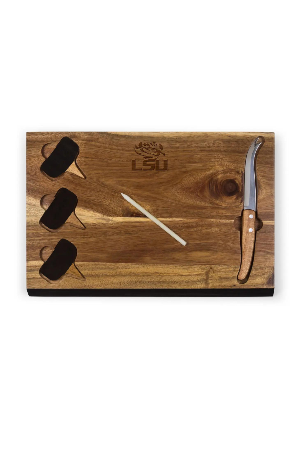 The delio cheese board and knife set includes a full-tang stainless steel fork-tipped cheese knife and three cute little chalkboard cheese markers neatly stored in carved areas on the surface of a beautiful acacia wood cutting board. This small and simple charcuterie board set has everything you need to set up a remarkable meat and cheese tasting platter at home or on the go. Don’t forget to use the included soapstone pencil to label your cheeses - and write your own special message on the chalkboard area along the front edge of this easy-transport picnic cutting board.