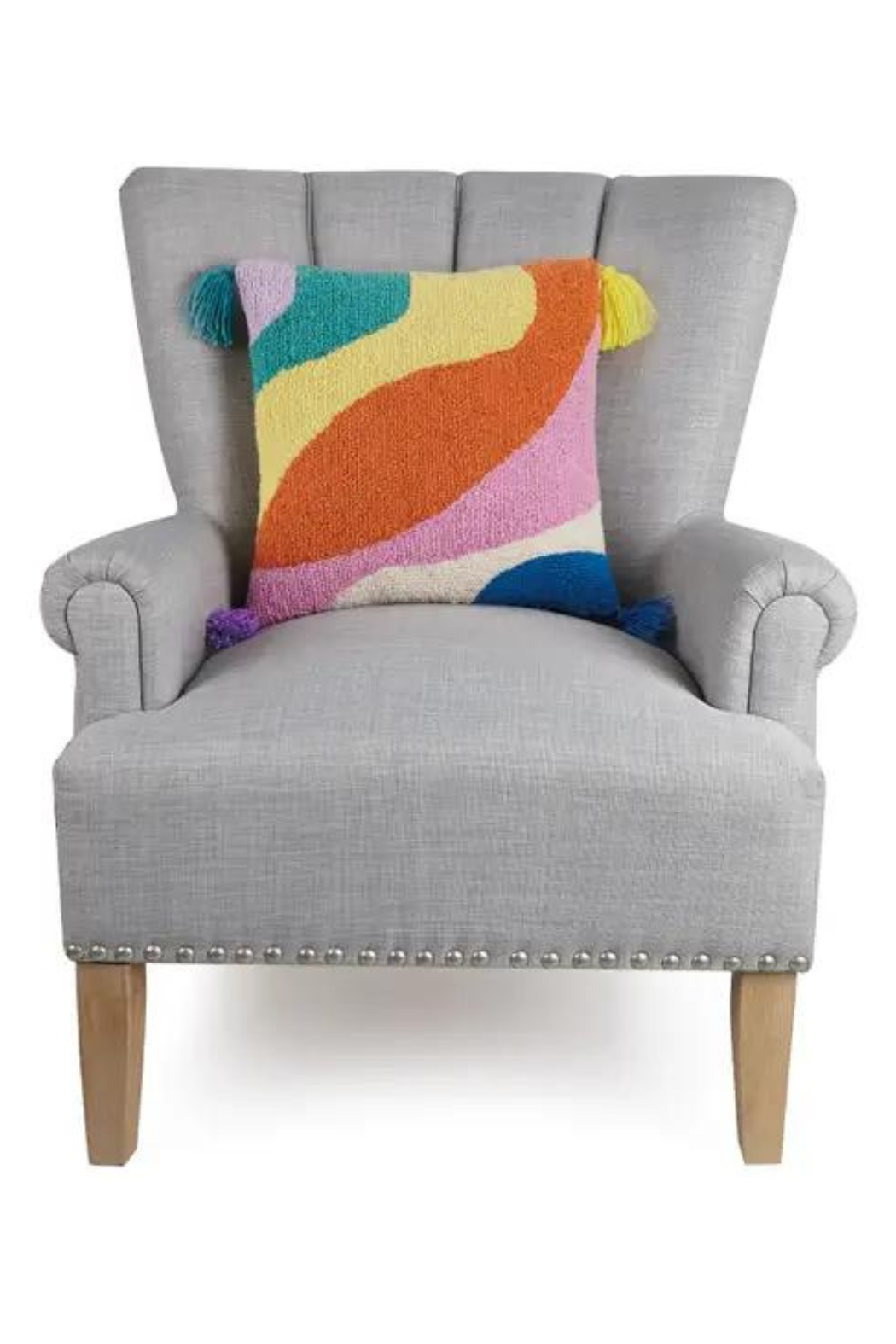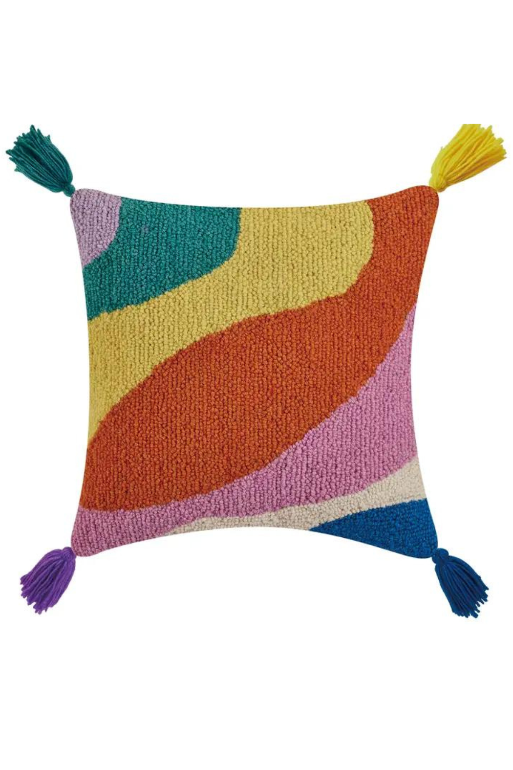 ★100% wool hooked square accent pillow ★100% velvet backing ★Includes polyester insert, zipper closure ★16X16" throw pillow ★Designed by Ampersand