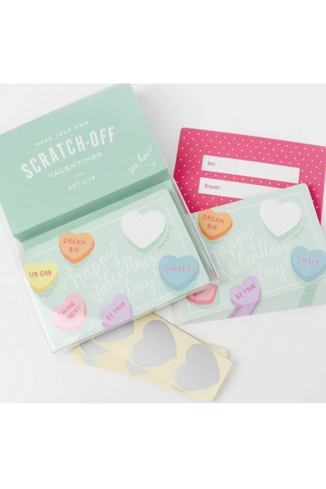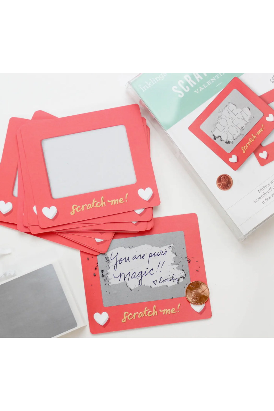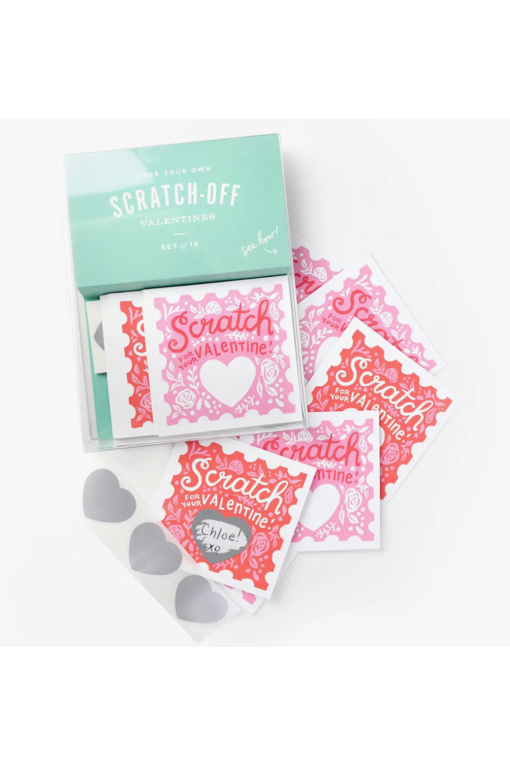 Hide a secret message in a scratch-off! Write your message, cover it with the scratch-off sticker provided, then scratch to reveal! These cards are so much fun for all ages. Box set includes an assortment of pink and red valentines! (9 pink, 9 red + 18 stickers)