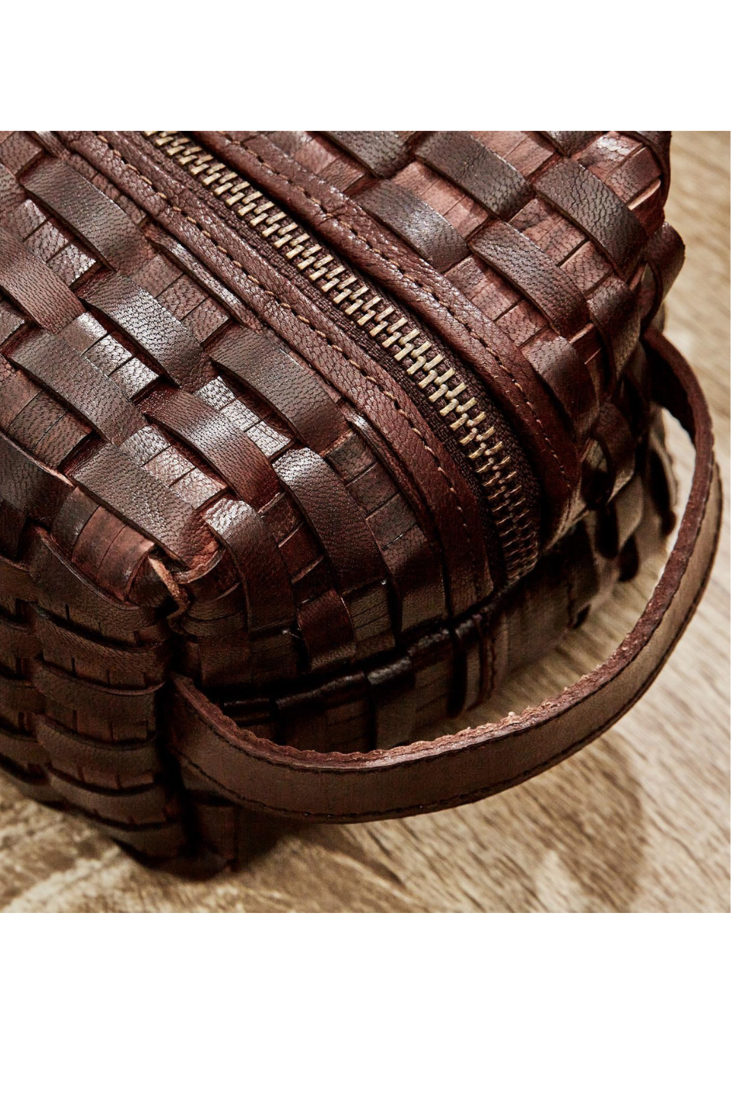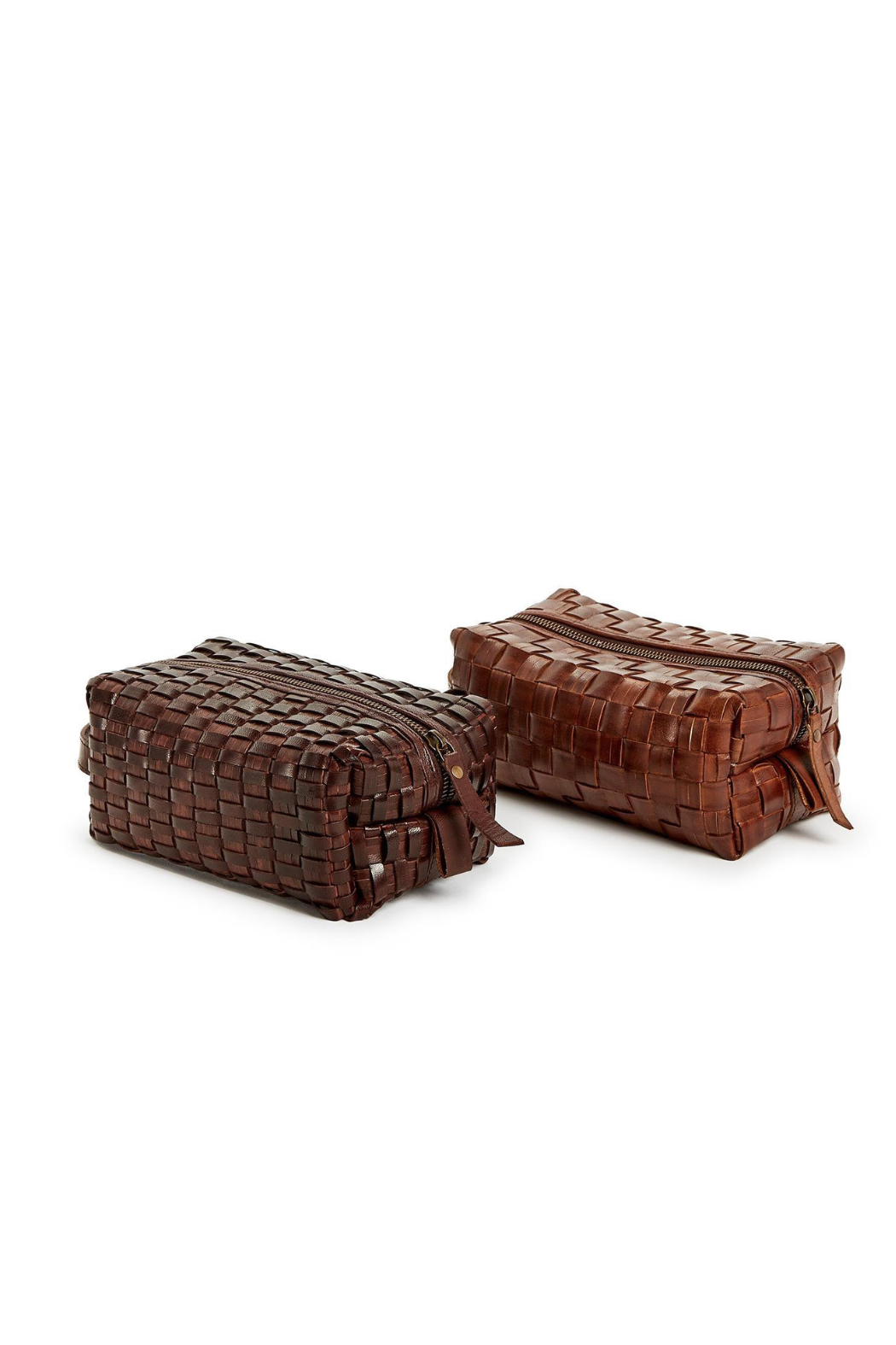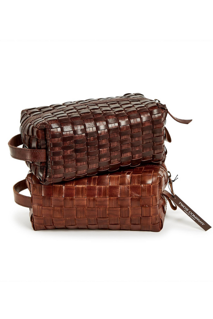 Featuring a chestnut woven leather exterior in two distinct patterns, this dopp kit exudes sophistication and elegance