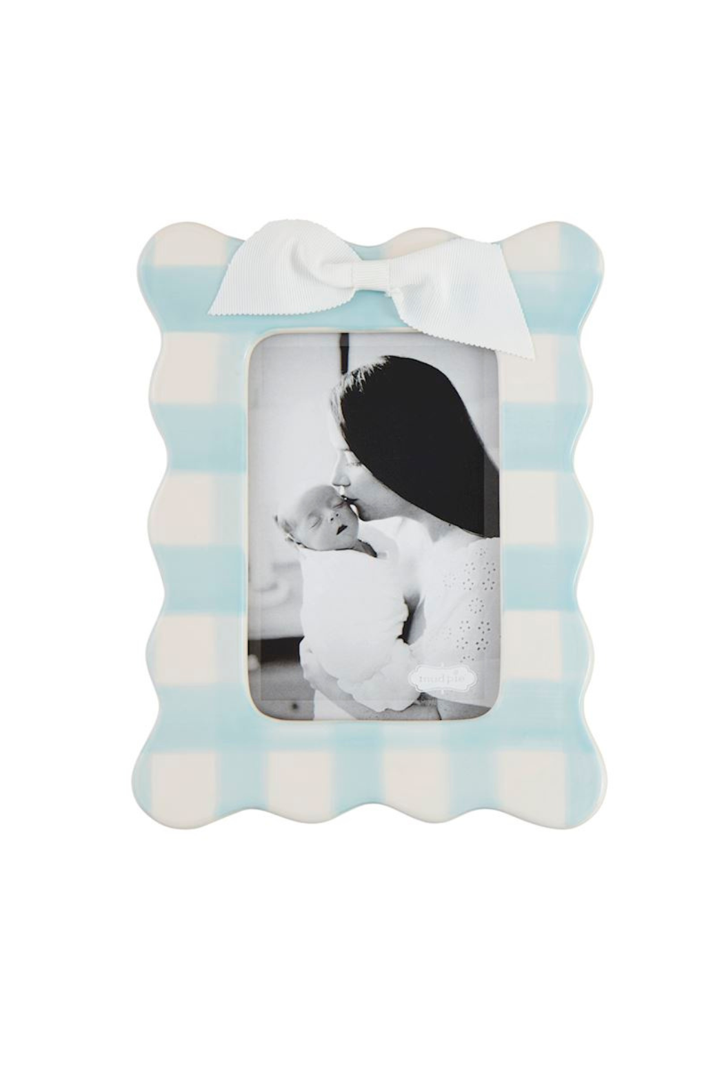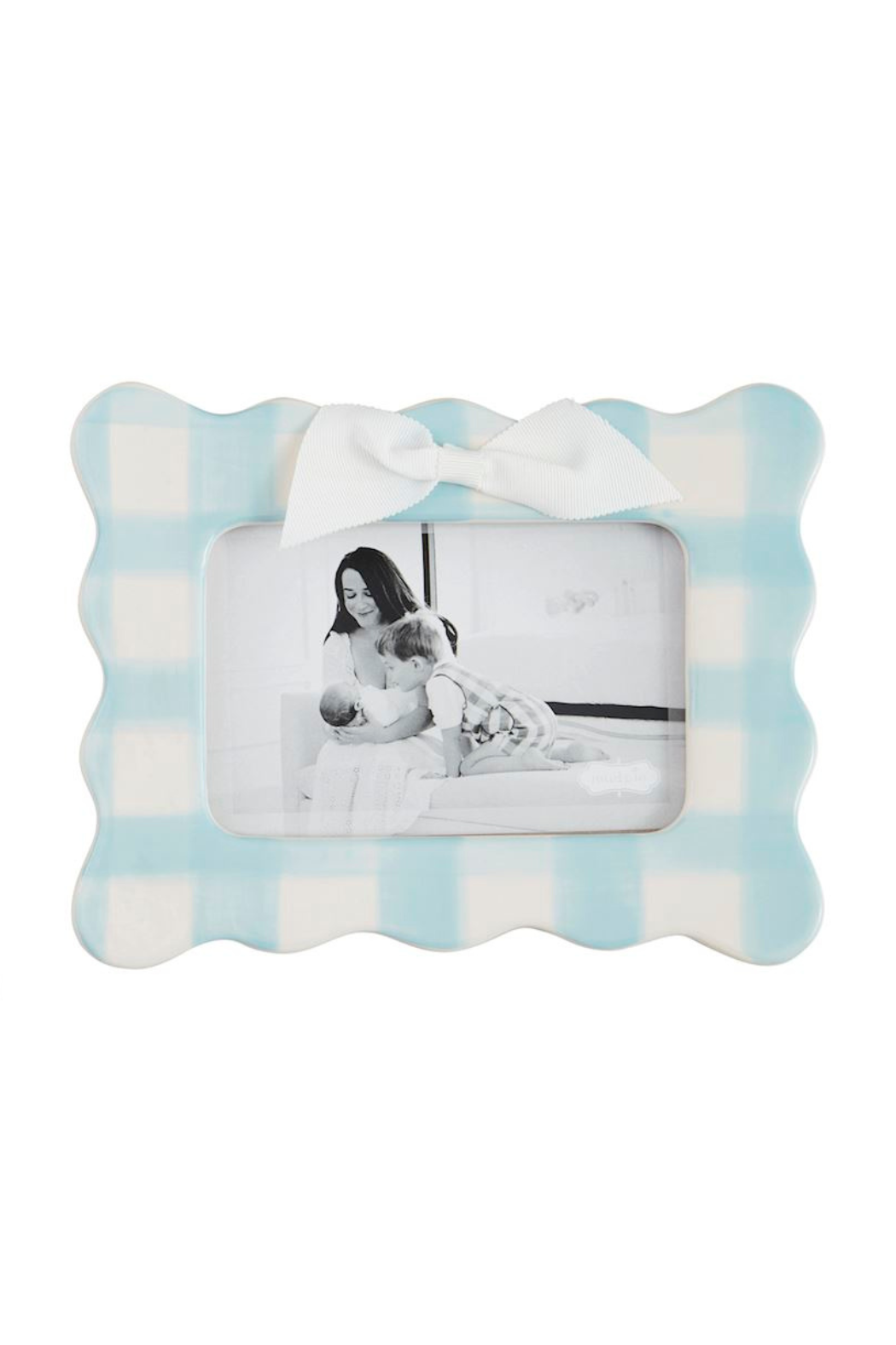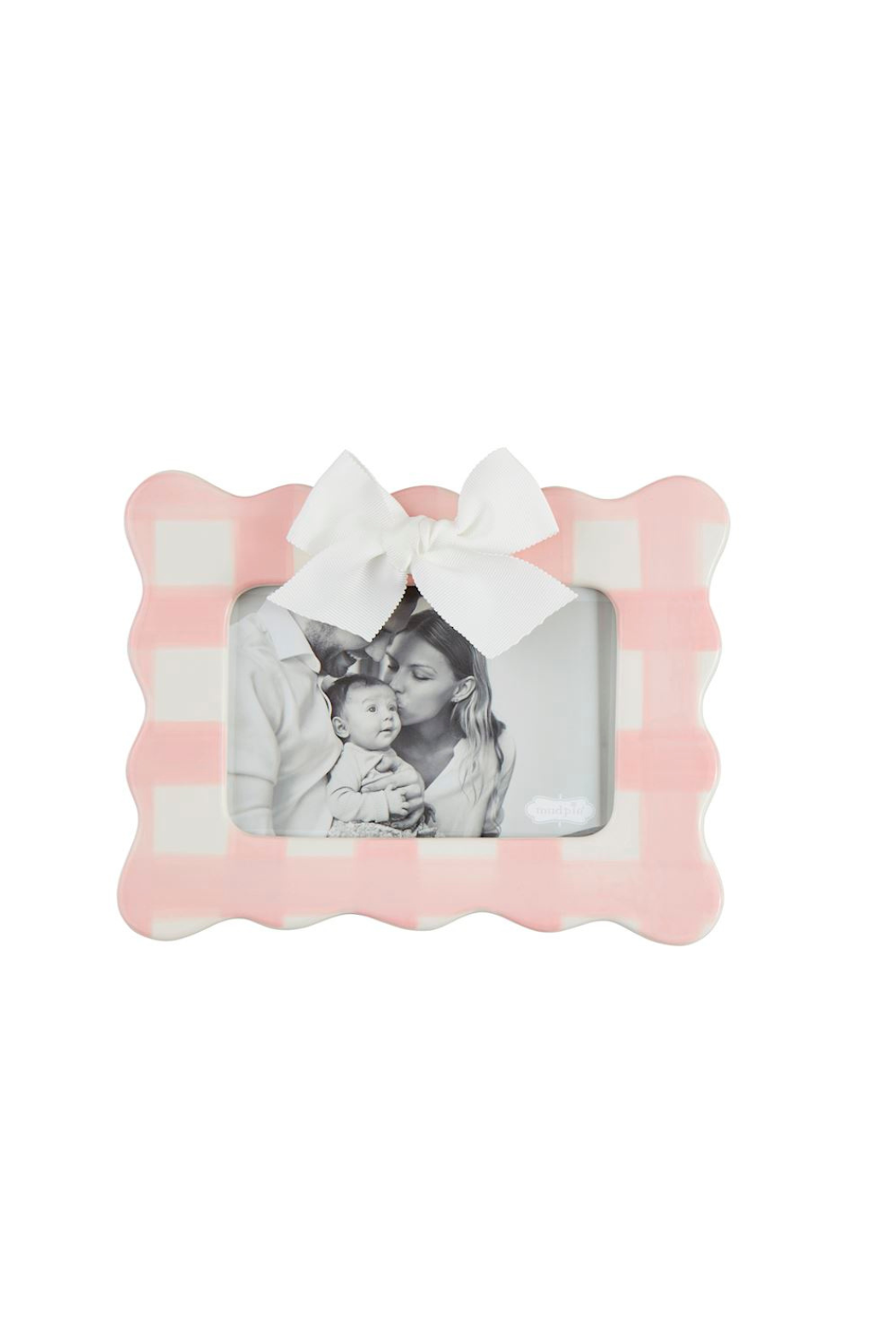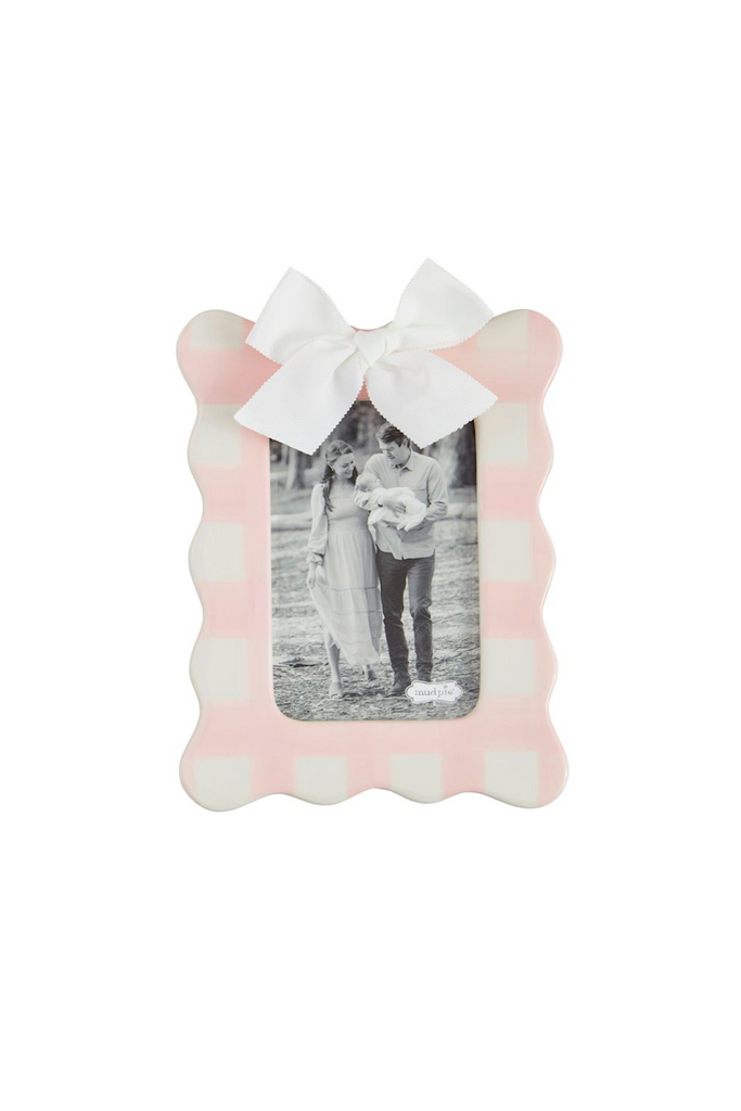 Hand-painted ceramic 4" x 6" frame features scallop edge and hat ribbon bow. Easel back.