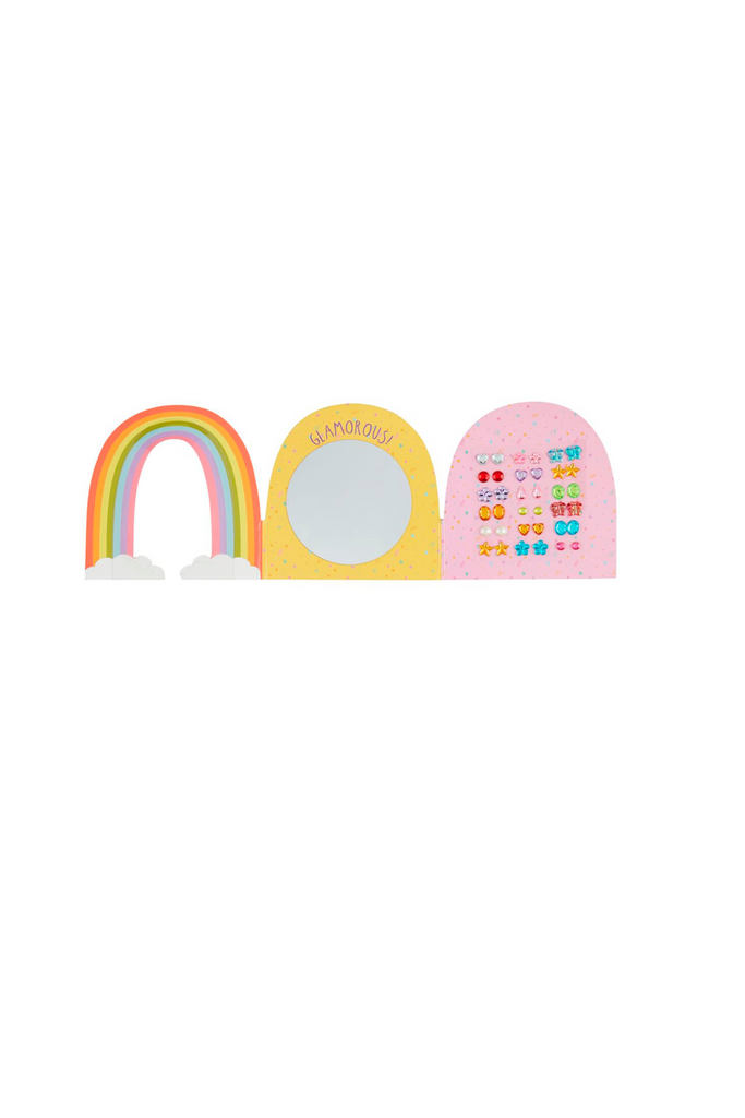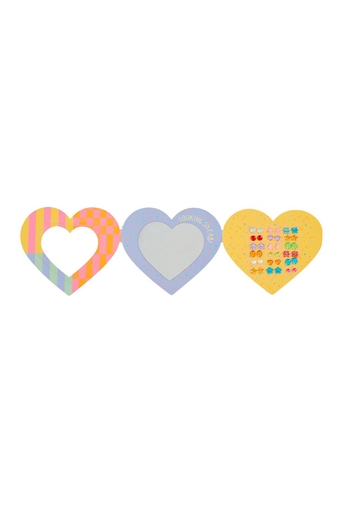 36 pairs of stick-on jeweled earrings come on tri-fold display card with kid safe vinyl mirror. Ages 3+. Comes with displayer.